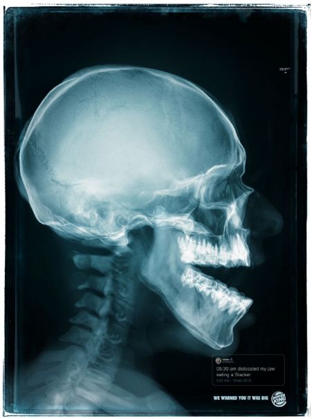 X光创意的海报,通过不同的脱臼来说明汉堡真的大大大,创意真是出乎人的意料之外!