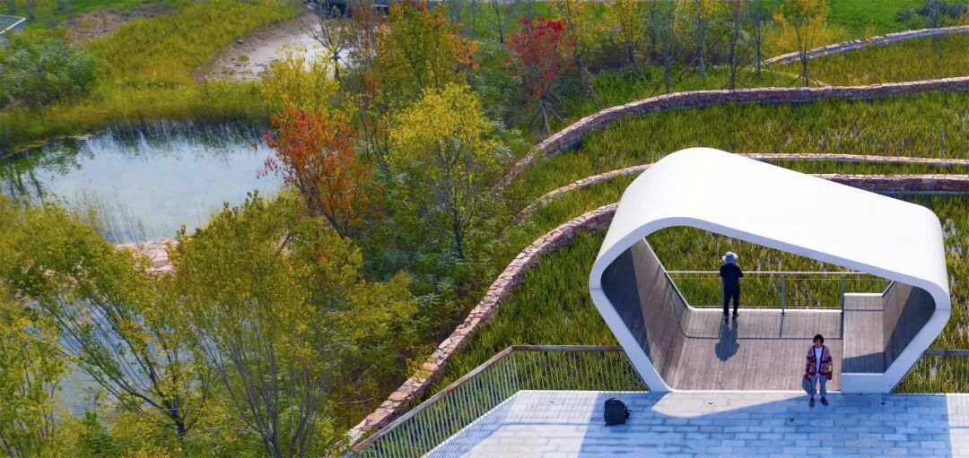 为改变场地现状,设计师采用生态修复策略,重塑绿色环境,效法“梯田”设计,通过填埋封存矿渣,置换部分土壤,将城市废弃中水引向山顶,分区域形成表流湿地、潜流湿地、净化池,同时借鉴表潜流交替的净化原理,引入邯郸城区水从山顶层层跌落、下渗、瀑氧,进行层层净化,达到景观水系使用标准汇入湿地,最终营造出错落有致、层峦叠嶂的景观效果。