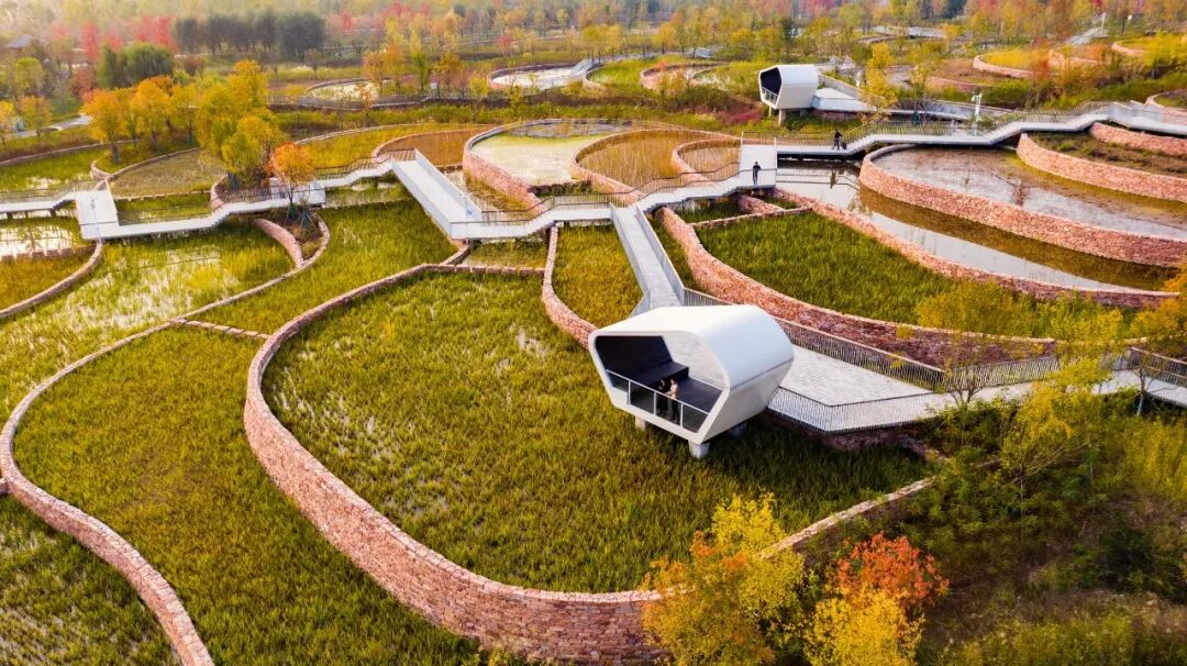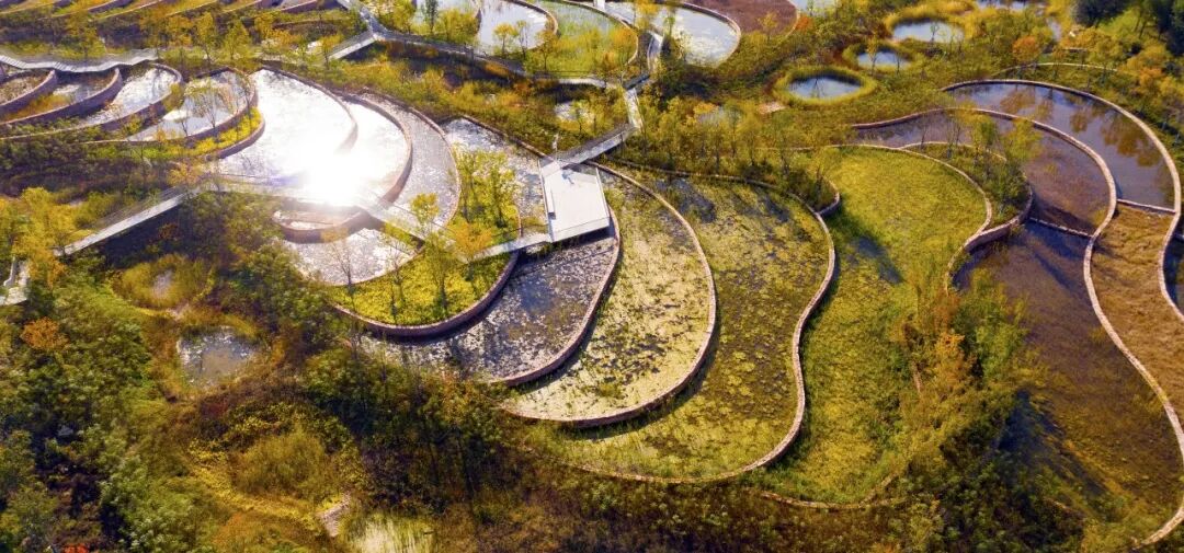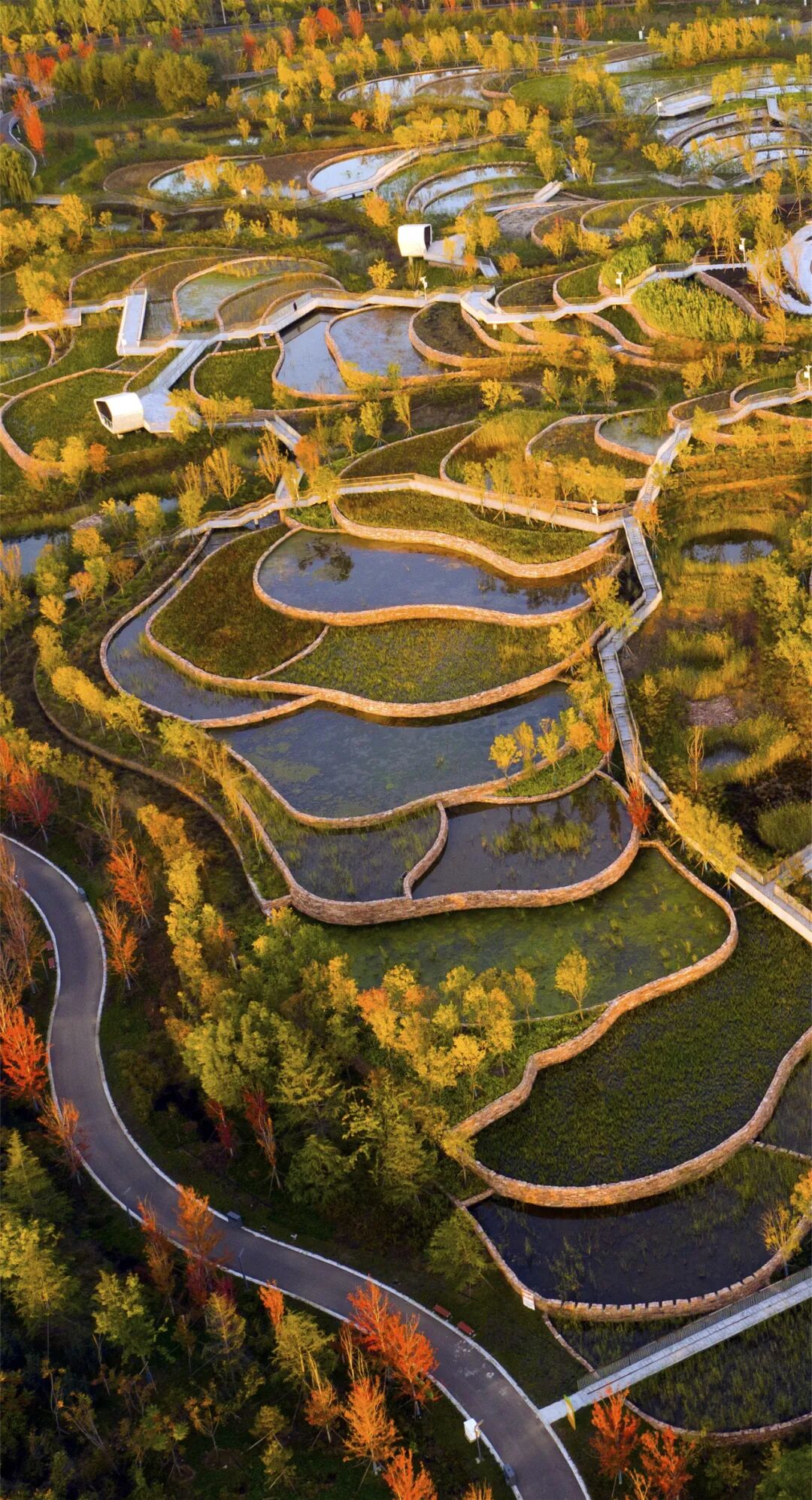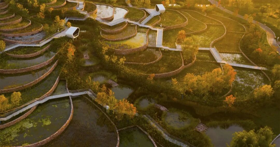 设计团队运用中国传统农业中的“梯田”和“陂塘”形式,结合科学的生态净化方法,将城市排放的废弃中水引向山顶,再经过台地植物层层净化,最终成为满足景观使用需求的水体。