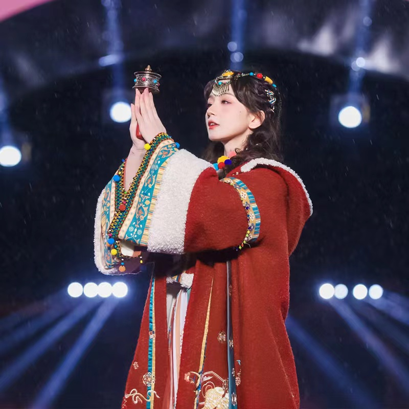 身着一袭藏族风红色唐袍