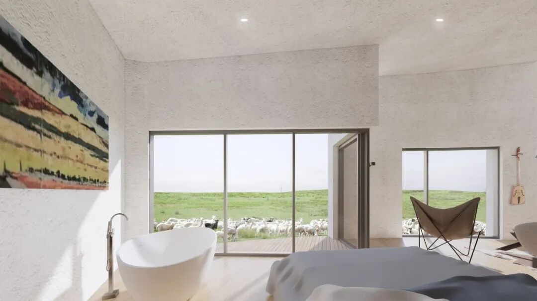 草原之家的内外立面采用白色大颗粒灰泥抹面,既回应了草原文化的色彩,也带来了民宿建筑所需的乡土感和在地性。为了适应寒冷地区的气候条件,建筑北侧相对封闭,南侧相对开敞,客厅和客房有着面对草原的良好视野,衬托出草原的水平和广袤。