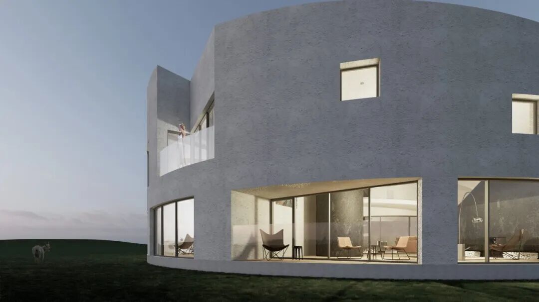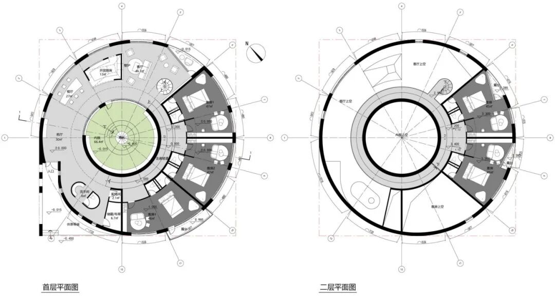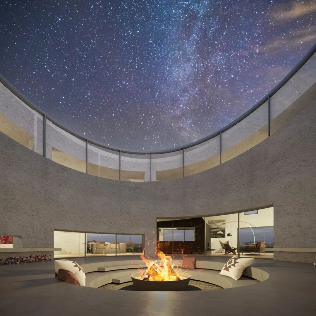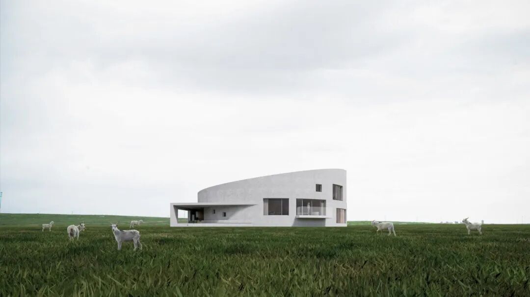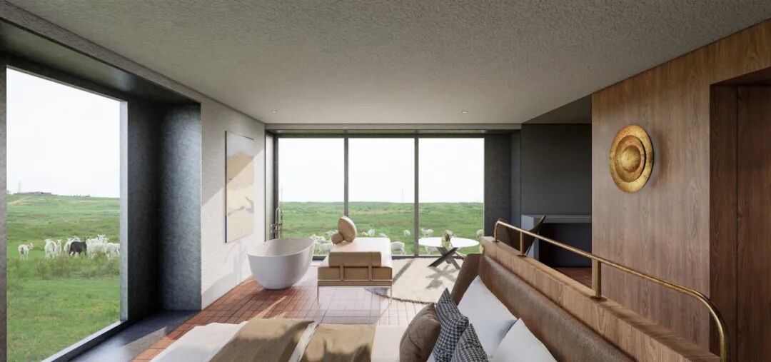 本设计以草原传统建筑形态蒙古包为原型,通过一个螺旋坡道将门厅、餐厅、起居室和位于上下两层的五间客房串联起来,并产生一个仰望星空和苍穹的篝火内院。设计用当代的建筑语言诠释了草原文化中天空和大地的关系,缓缓上升的坡道将天和地连接在一起。