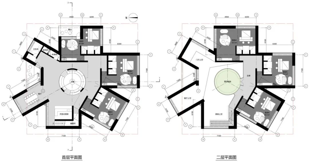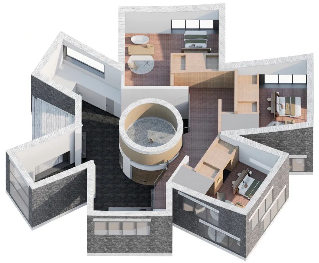 本设计是通过将记忆中的游牧小屋组成聚落而形成的花瓣形的民宿建筑。每一个小屋代表着门厅、餐厅、客房等独立功能,六个“小屋”围绕着建筑中央的火塘展开。放大的下沉式火塘同时也作为民宿中最主要的公共客厅使用,火塘的上方是一个圆形的室外漂浮庭院,白天的环形光线会顺着漂浮庭院底部溢进建筑中央。