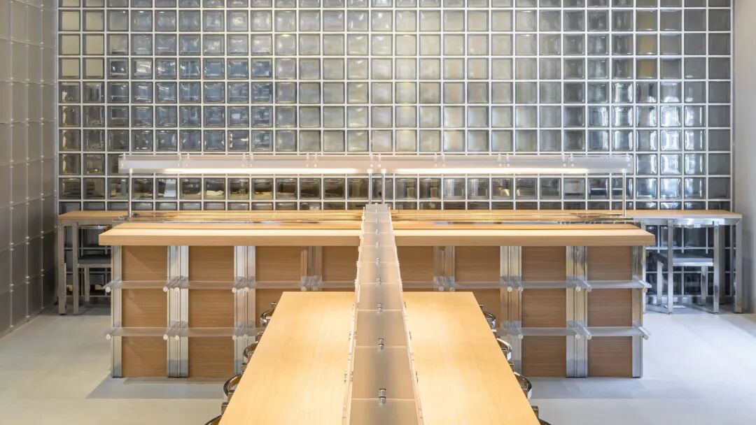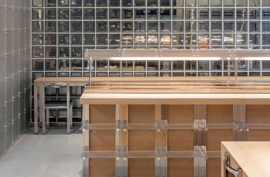 该项目在规划时对面包店的展示进行了细致的关注和考虑。在设计师进行分区规划时,除此之外,最重要的目标是将顾客的注意力首先吸引到面包店的展示上。因此,通过使用玻璃砖和磨砂的透明丙烯,特意将不必要的元素挡在视线之外。