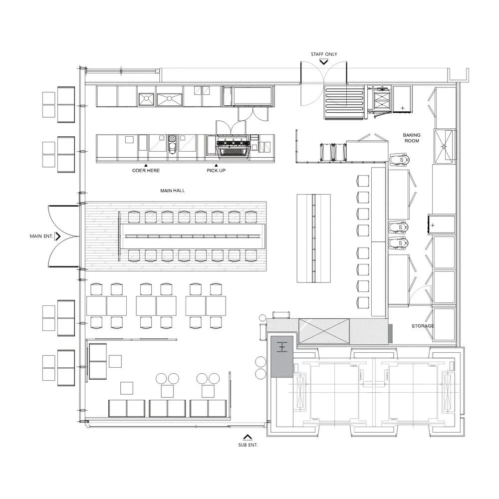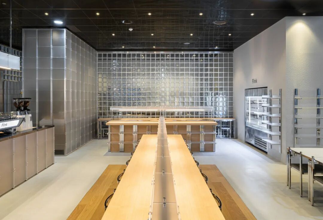 Flink是一个面包咖啡馆品牌,位于韩国IT公司集中的板桥区,平日里人流如织。这个项目的设计要点是展示连续的矩形图案,这些图案通过模块化的形式组织起来。在模块化中使用了重复的设计语言,并在安装了不锈钢板的高天花板下提供了不同材料饰面的纹理变化。