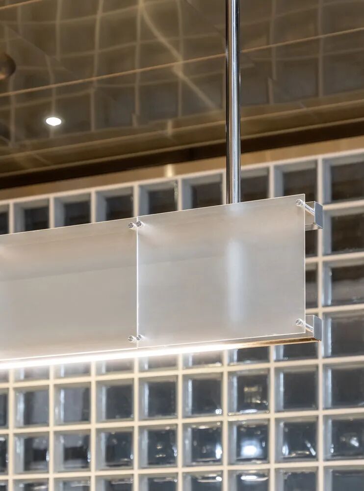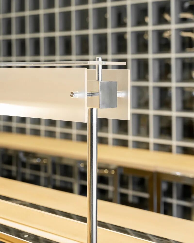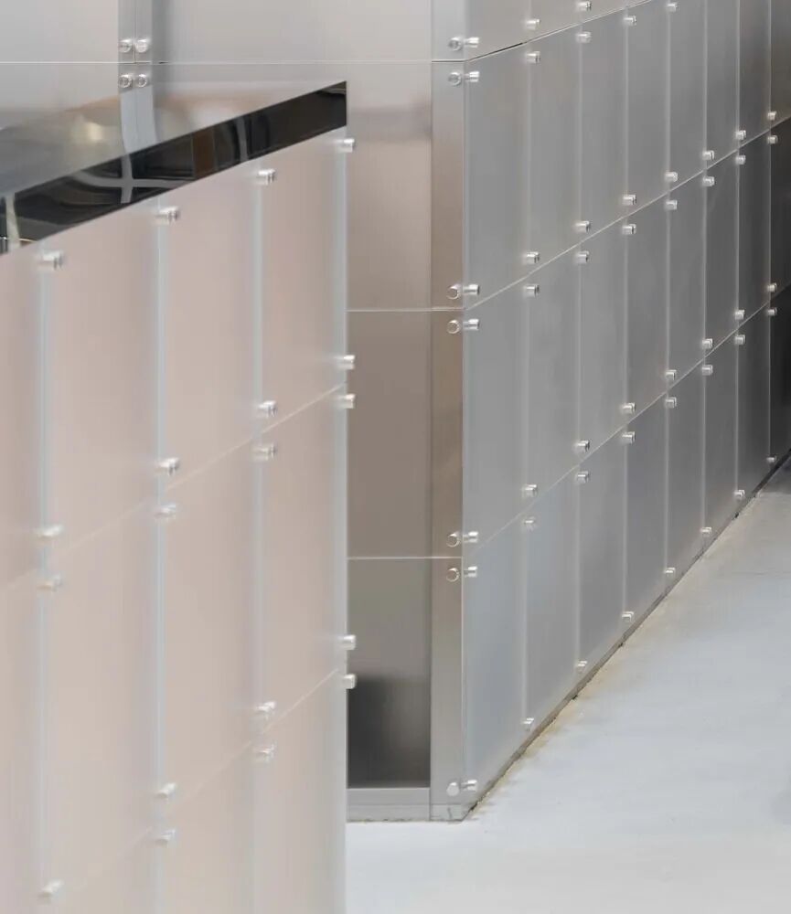 人们可以看到烘烤室墙壁上对比鲜明的剪影,用透明玻璃砖完成,创造了一个蜿蜒的剪影场景,并与漫射光和磨砂丙烯酸树脂创造的不同剪影形成对比,同时完美地分离了运动路径。可以说,这个场地是所有材料的整合。
