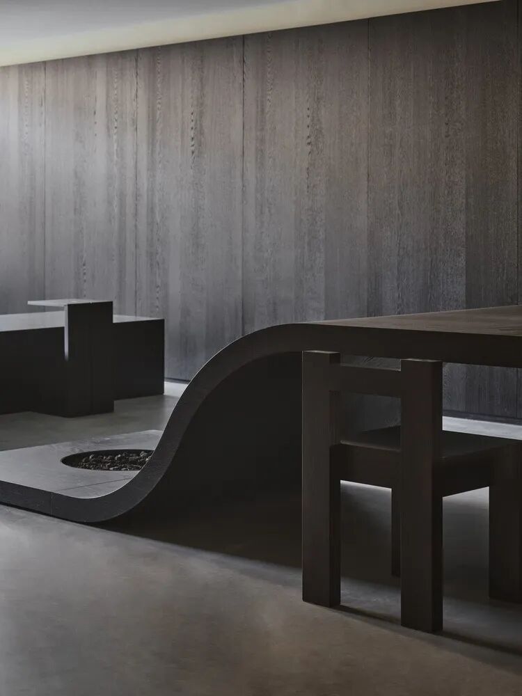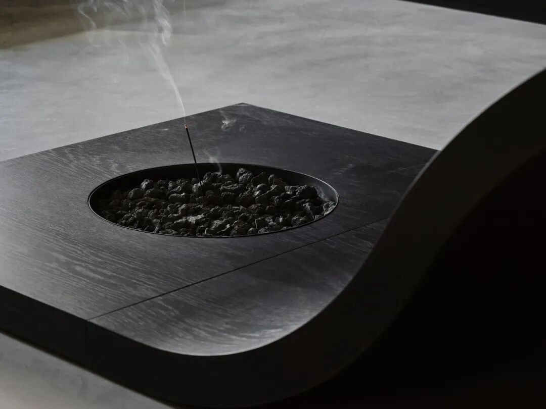 二楼是 Ouvrir 咖啡馆的面包店所在的地方,但在这里它也被谨慎地隐藏起来,将视线的焦点完全放在低调的座位区。大部分家具都是类似的,一张细长的公共餐桌,一端有一个向下滑动的桌面,这是设计的焦点。桌子的底层部分看到一个圆形的空隙,里面装满了用来焚香的鹅卵石。