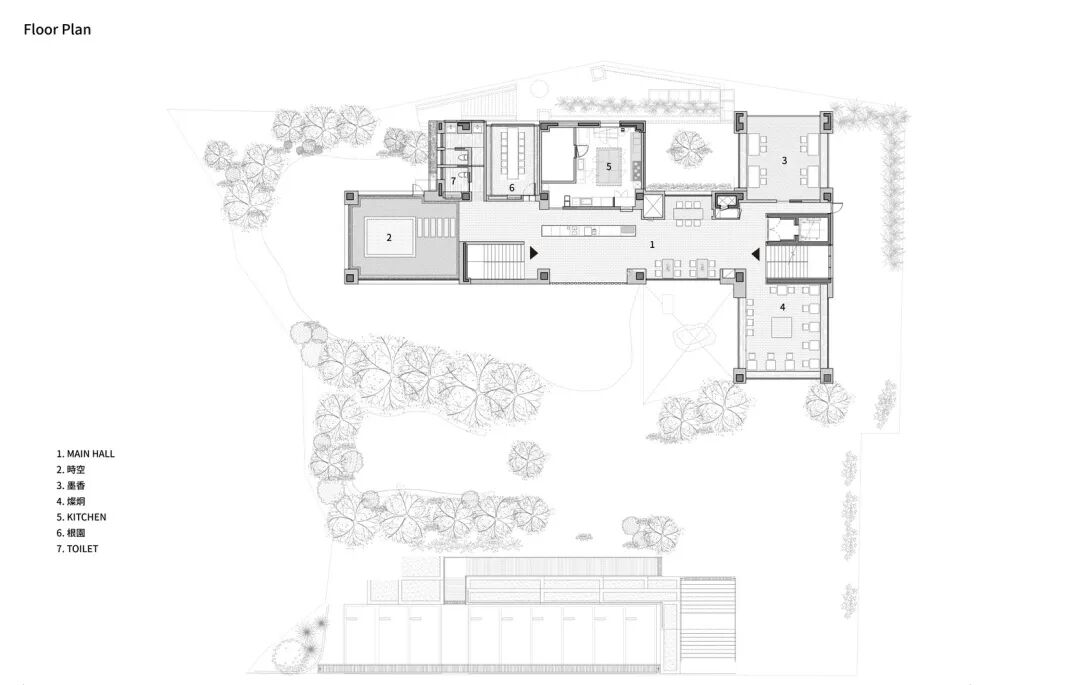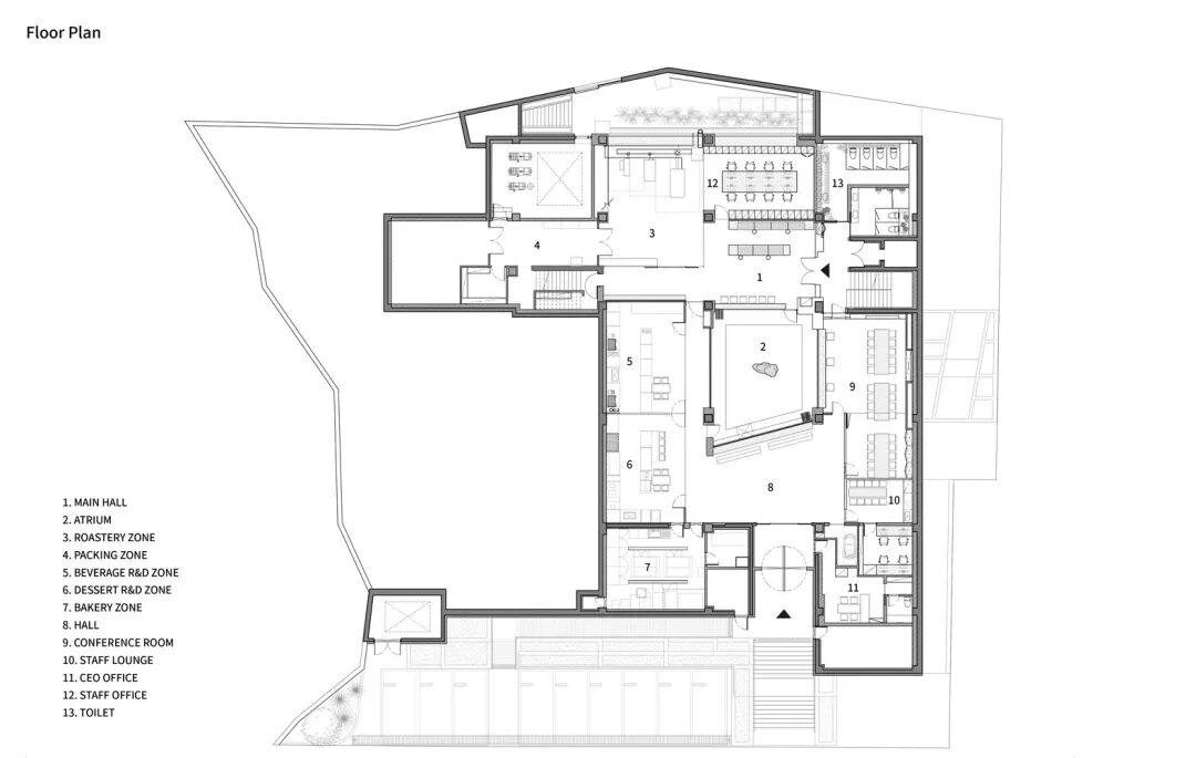 建筑由从地下一层到二层的空间组成。Bumchun Group的办公室、烘焙室、烘烤室和实验室都位于地下室,而一楼和二楼则分为两个品牌:Time to Bakery和Time to Bistro。'Time to Bakery'是一个与糖果和面包有关的烘焙品牌。在这些空间里有一个独立的咖啡师区域,供人们体验手冲咖啡。'Time to Bistro'是一个通过预订的私人经营品牌,位于二楼。与'Time to Bakery'不同,人们可以在一个单独的柜台点餐,享受早午餐。