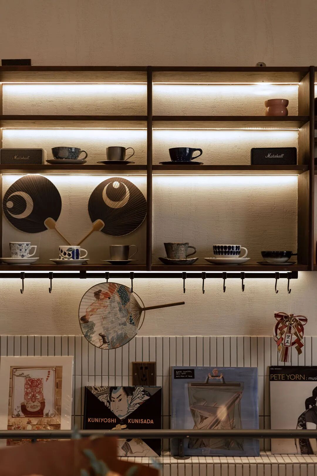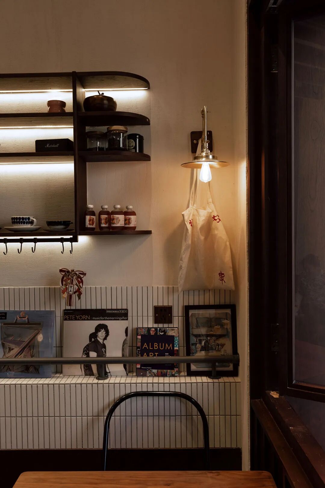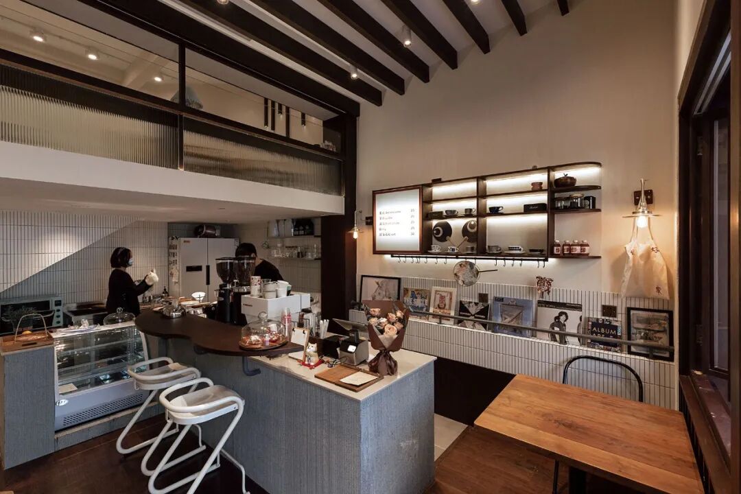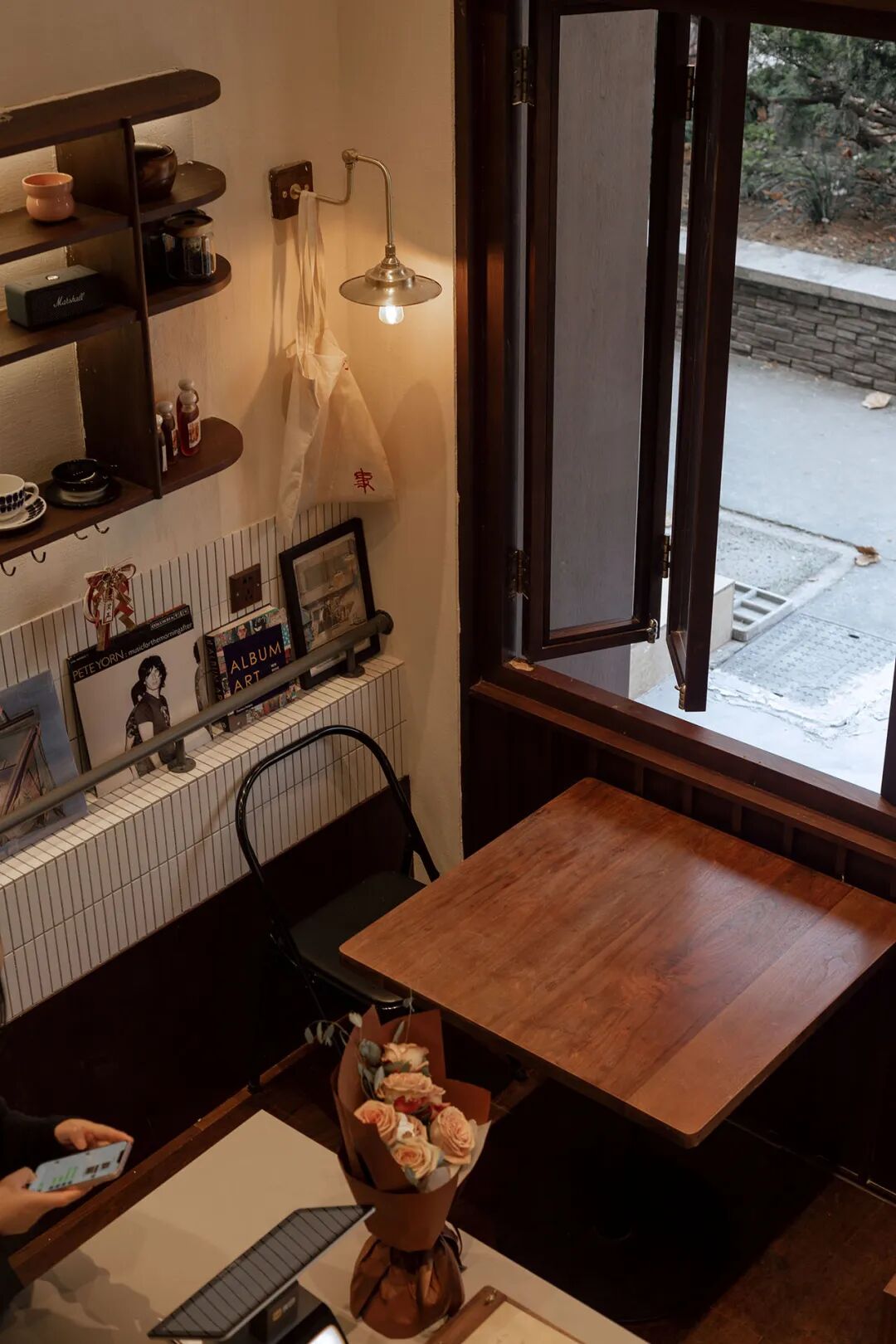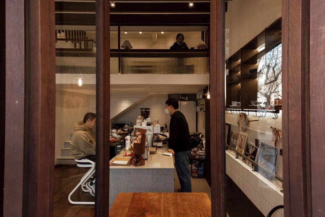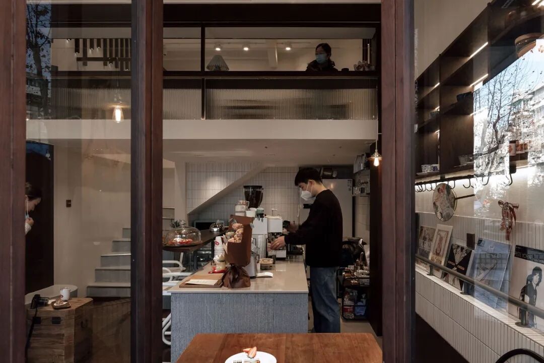 门口内嵌设计了面向街道的室外座位。平日里折叠窗户打开也拉近了店内与街道的距离感。我们希望咖啡店能更多的和谐融入在街道中。