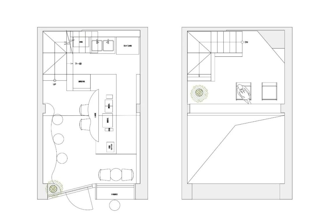 一楼设计了贴墙的卡座,吧台处还设计了高脚凳。此两处座位可以与咖啡师面对面交流,欣赏咖啡师精心调制咖啡的过程。窗户边的座位连接室外卡座,打开折叠窗户可看到门檐下方的发光字“Good things happen”(好事发生)。我们希望在不大的店内也可以设计多处不一样的座位,让客人可以有不一样的用餐体验。