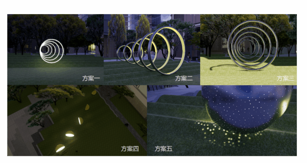 波浪地形逐层增高,仿佛引力逐渐增强。此处关于月的装置是一组抽象的表达,尝试了多种表现手法。一种镜面开洞,通过人在行进中的视角变化产生月相变化的视错觉;一种通过提炼月球行进轨迹结合LED灯带光效形成序列光环;还有一种也是最接近概念方案的一种,五组镜面穿孔圆环序列按相同比例依次缩放,仿佛引力作用下渐渐远去,内置呼吸灯光效果,夜晚下犹如浩瀚繁星。为加强装置的漂浮感,底部基座采用镜面不锈钢反射周边环境。