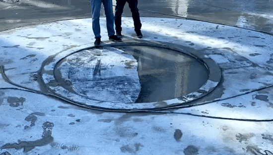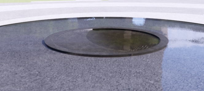 溢水模拟潮汐变化,水痕还原月相变化——很浪漫的想法!但现实很骨感,找一块直径三米,干湿变化明显、无石胆、无白筋的A级石料已实属不易,还需要手工雕刻抛光,精度控制在两毫米。液位不说谎,每一个打磨不到位的地方都有一条参差不齐的液位线。这是一个进水和回水在同一位置的水景装置,通过给水管和回水管的径流差实现定时给水满溢之后自然回水,形成潮汐变化。整个过程有八分钟,停下来,等待一个八分钟的阴晴圆缺恐怕已经非常挑战城市人的耐心了。
