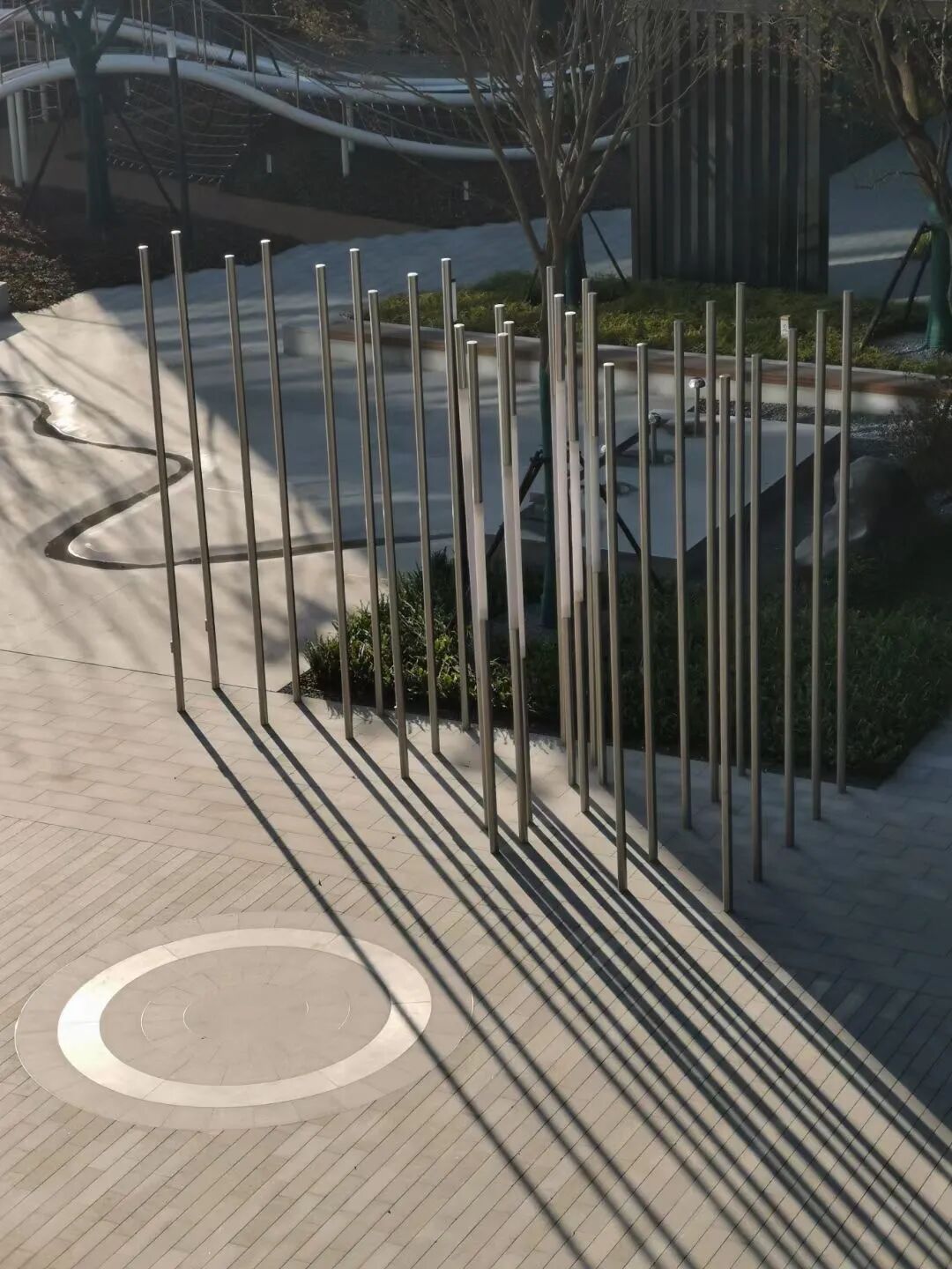 潮鸣里有争议的设计细节还有很多,比如廊架的颜色,比如守着银杏林边的香樟的高度,比如自然种植与工整的修剪性绿篱的配比度,比如原示范区里日本进口的自然石在社区里的重置,南区入口大堂即“挡”(挡里面居民的视线)又“望”(大堂消费者的视觉享受)的景观“装饰”......我一直觉得自然与艺术始终是人类的必需品,无论是豪宅还是平常小区,每个人都拥有享受的权利;同时又因为自然越来越人工、艺术越来越商业而成为人类真正的“奢侈品”。潮鸣的景观设计努力的方向是在无法回避的人工景观框架下(物业对植物维护的需求、业主对植物整齐度、观赏度的需求等等),植入景观艺术装置,改变传统景观中“观、被看”——人与景物二元对立的状态,丰富其参与度。
