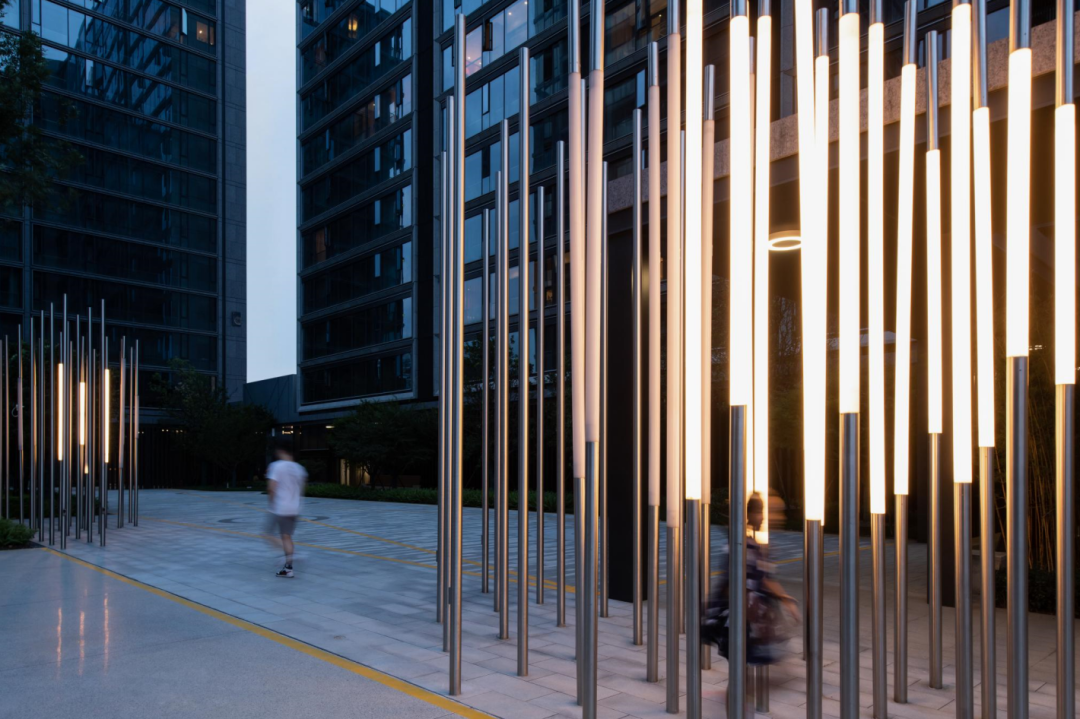 这层“屏风”在特定视角可以呈现满月效果,六组互动感应器根据行人触发的多少,使整组灯光呈现出不同“月相”的变化。高低错落的发光管部分是特殊定制的PC光扩散管,均匀柔和的光效搭配拉丝不锈钢柱,营造出朦胧清冷的月光效果。
