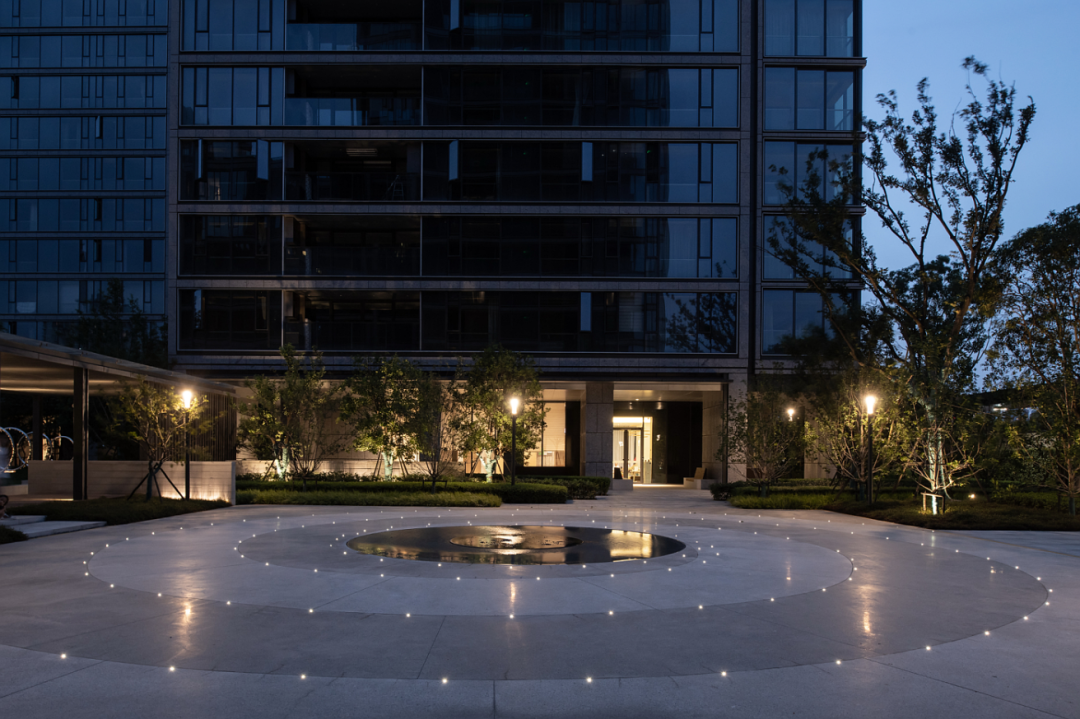 户外空间之间因各自的自然条件,如光照、可达性、消防面积等,各有相应的空间布局及活动侧重——如中间最大的一块15米x15米的消防登高面,由最初的漩涡浅水面简化成最终的铺装纹理,以及中心的一个月圆出水装置。该装置整石雕刻,用溢水模仿月相变化,同时暗示随着月动的潮汐涌动。整石上微弱的坡度、出水口与周边场地的微小高差,要求施工精度达到1.5 cm。漩涡形态的材料是水磨石,最后请了做杭州天目里的意大利混凝土团队指导施工。