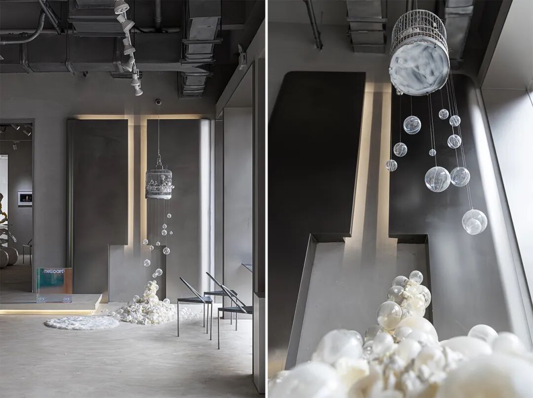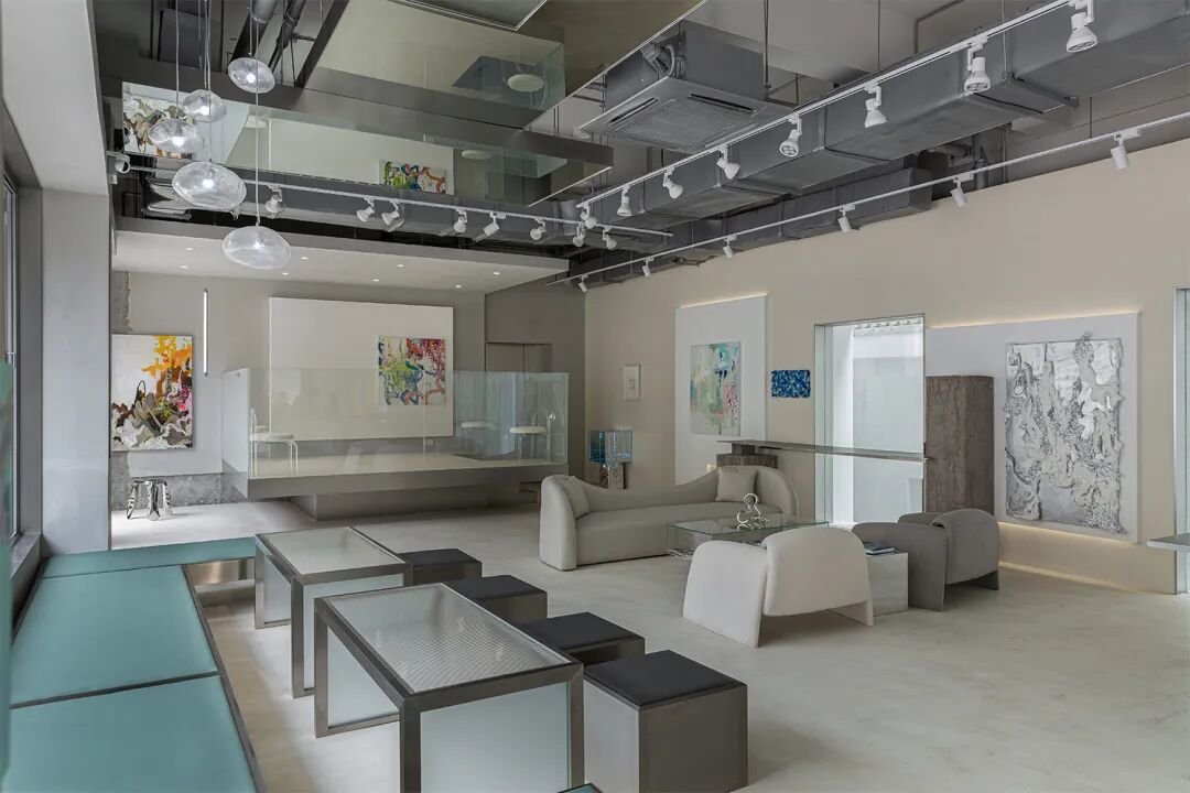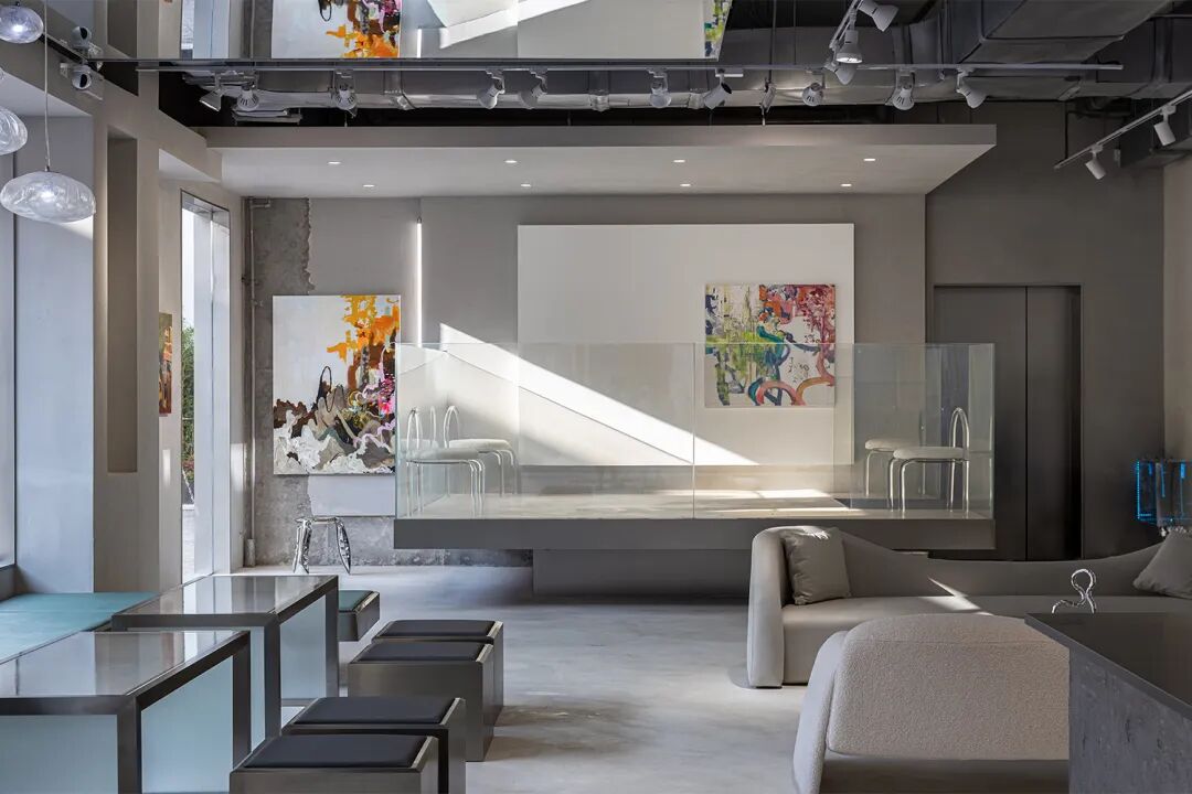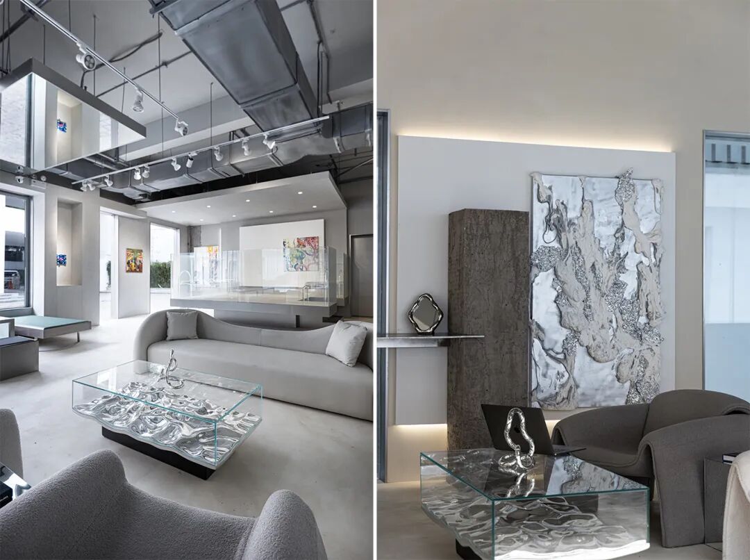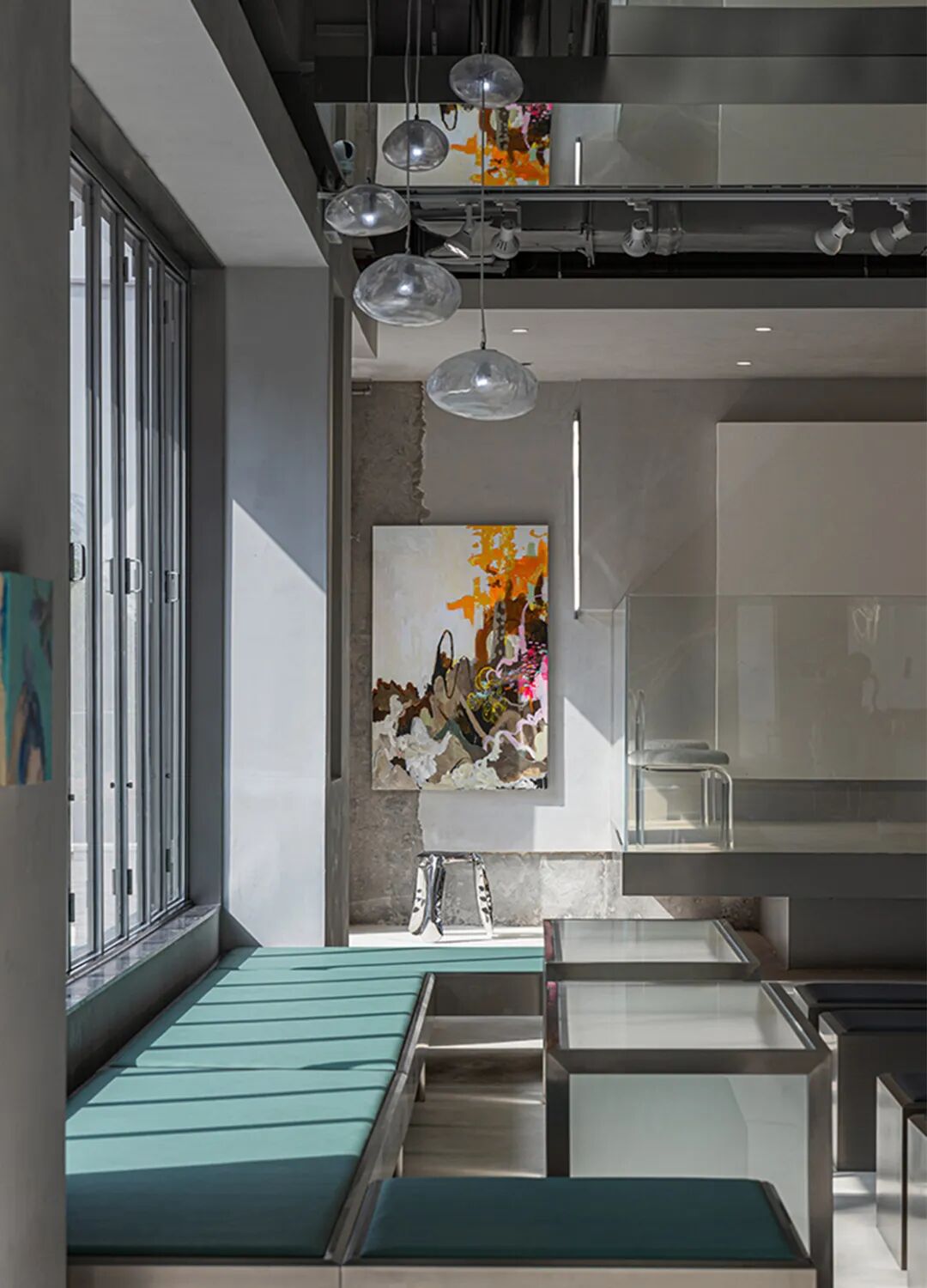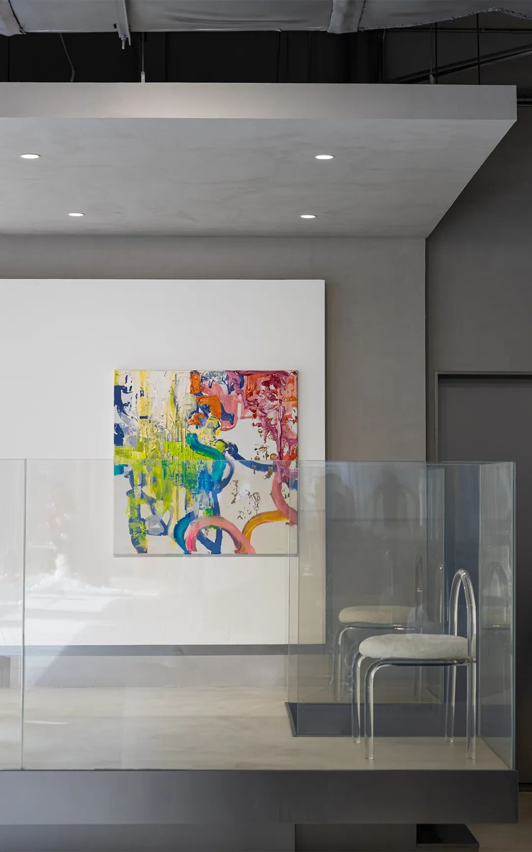 考虑空间中需承载艺术策展等功能,设计中保持了钢筋水泥的建构原态,将并预留了大面积灰白纯色,此时细节材质与灯光配合便显得尤为重要。大量金属、通透材质、微水泥及原墙结构衍生空间感受中的对立关系,并形成视觉冲击,给予画作、摄影等相关艺术作品展示,为空间预留更多可能性。