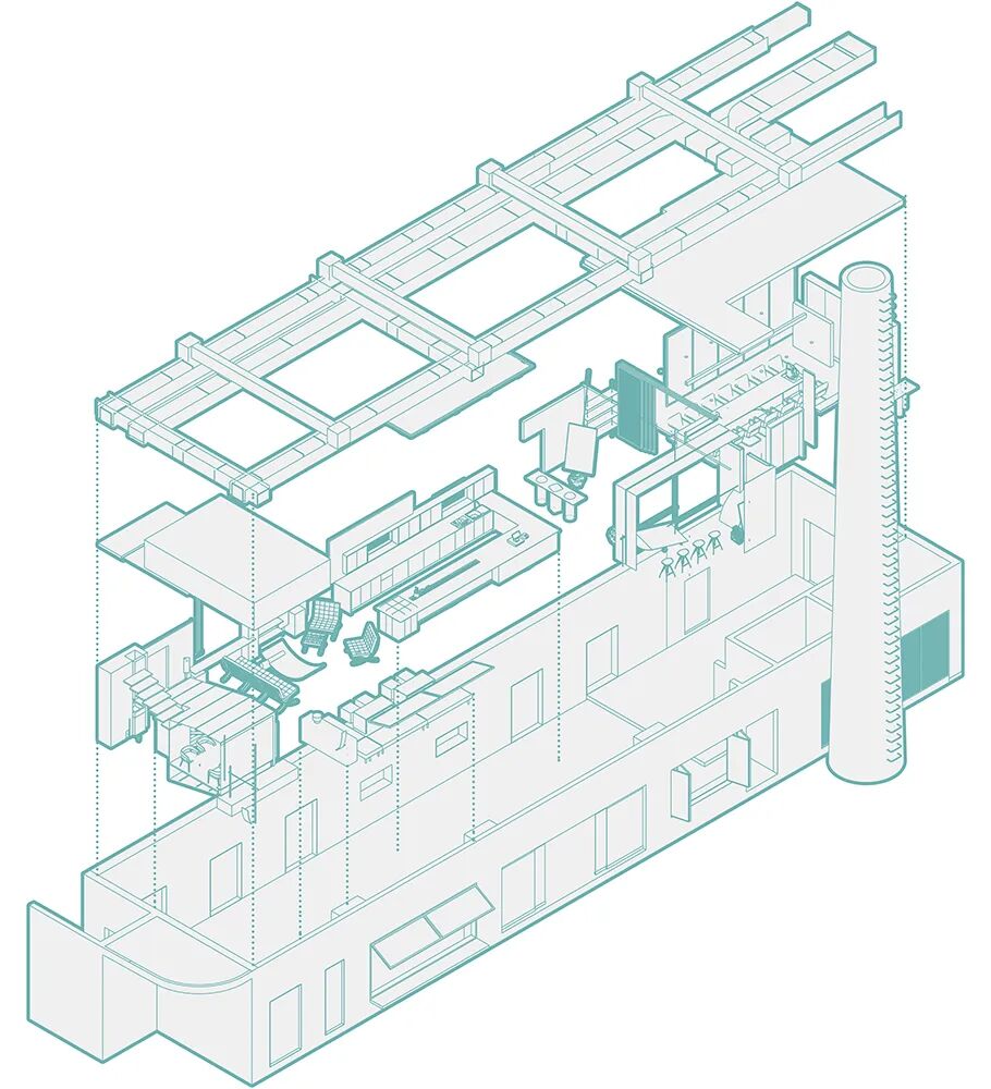 提供会议、零售、陈列展示,地面抬高与推拉门的介入使其可开可合,形成独立的空间内容,与主空间之间能够进行融合与独立切换。