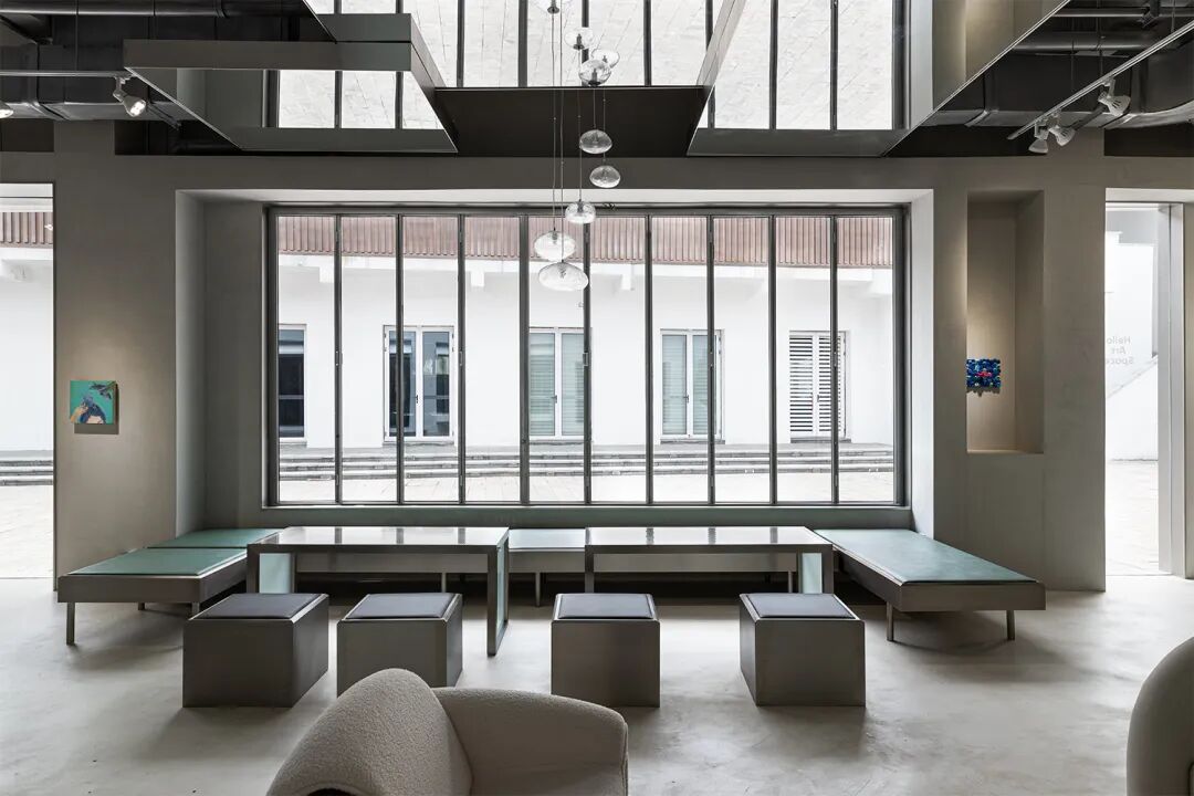 我们设置了多尺寸形式的卡座组合围成半固定形态。可以根据活动的需求可进行不同形式的组合变化。而背靠开窗区域的座位,可将纵向空间打开,使内外融合。