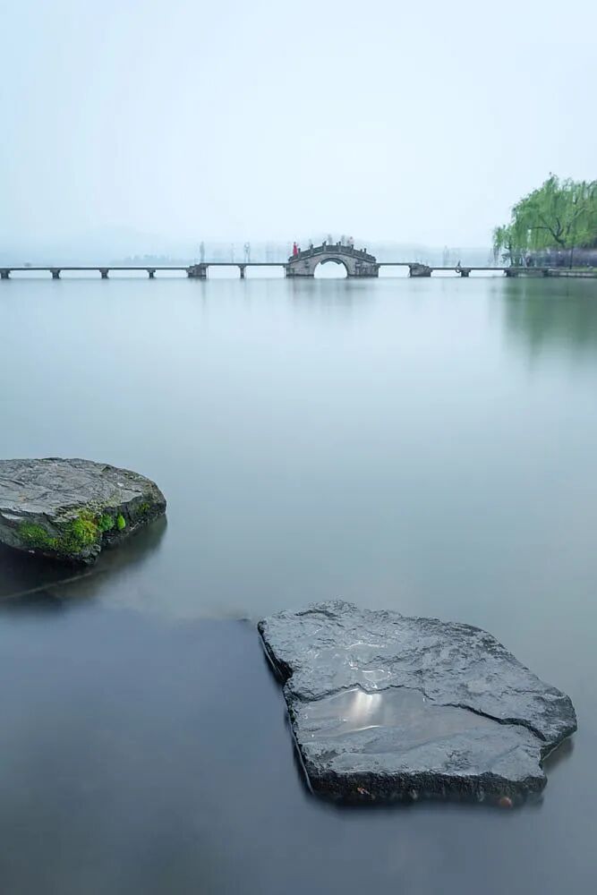 西湖中两道长堤苏白二堤,皆是由昔年西湖清出的淤泥堆砌,再在其上植树、披路、置椅、造桥,最终造就两条滨湖步道,酝酿出草长莺飞天的苏堤春晓,霜冷露重时的断桥残雪。