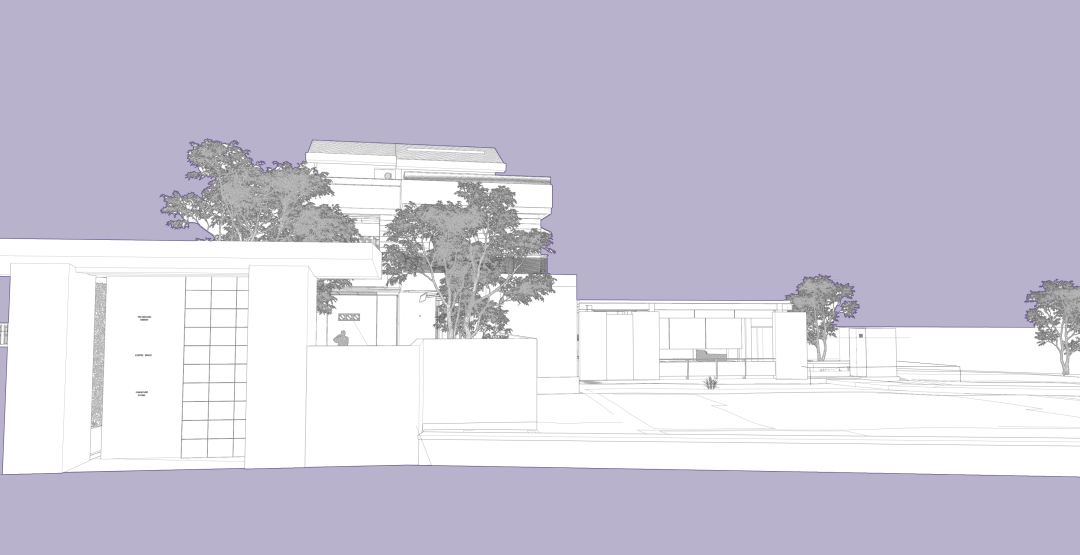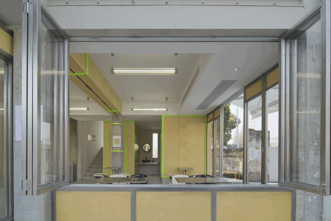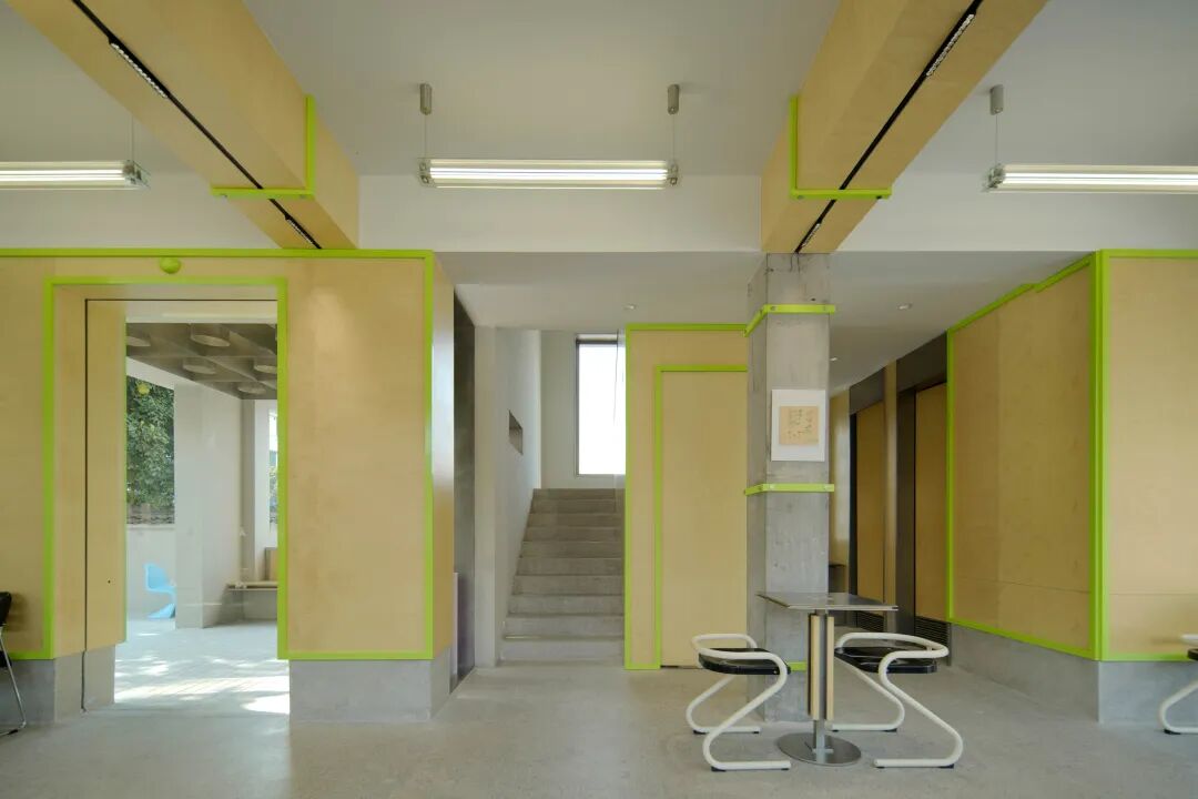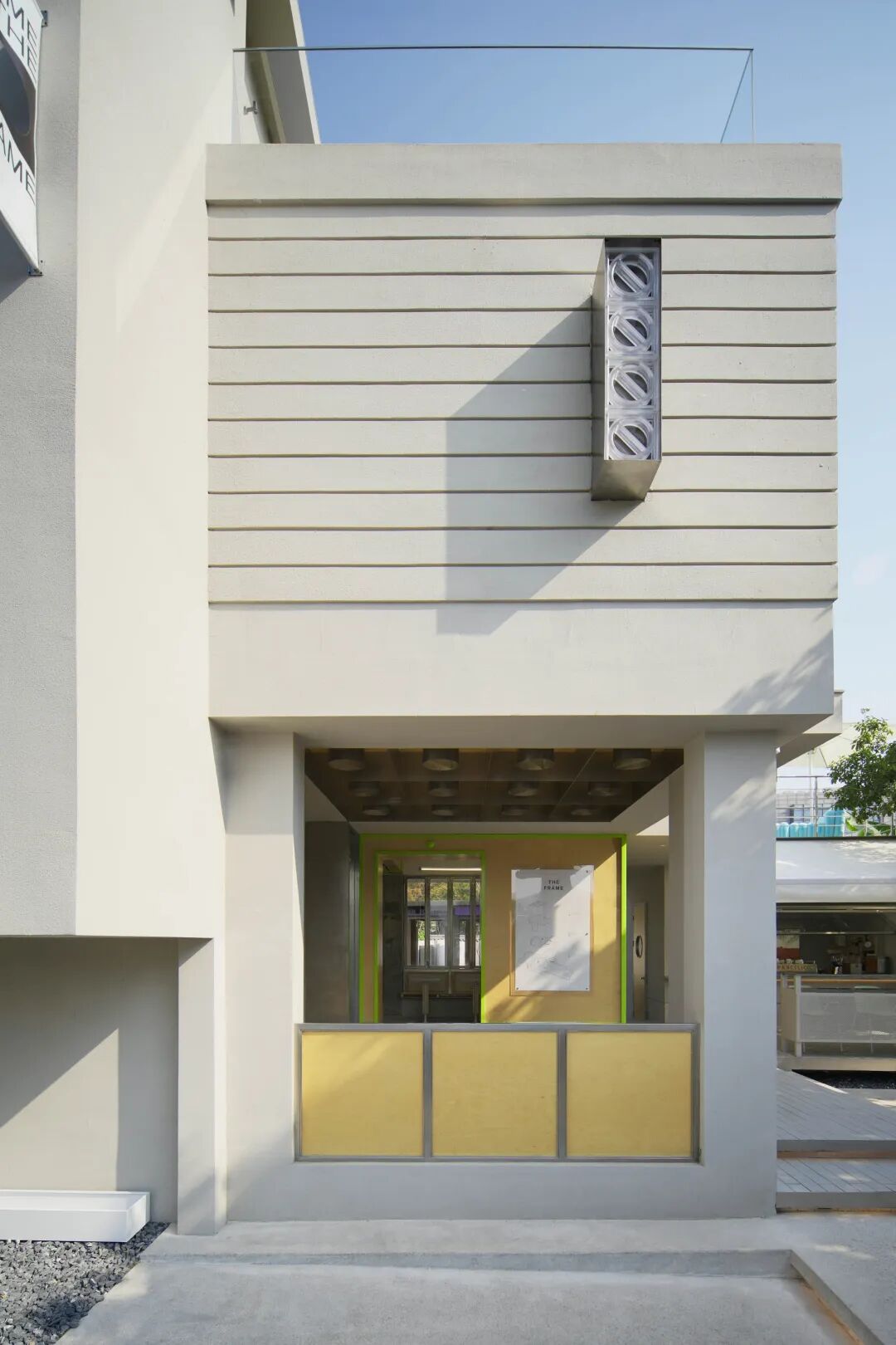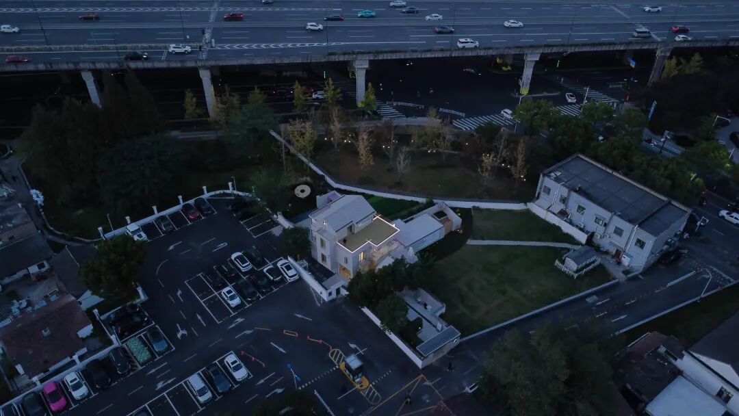 建筑左右邻靠着街道社区的停车场和公共大草坪,背后的彩虹立交也与之构成“快通达”与“慢生活”的对比。三层的主楼连接向户外敞开的单层平房,自然地划落出房前屋后的两个院子,以可开可合的设计语言实现空间的延展性,新的建筑形态也谙合“院落”的精神回归。