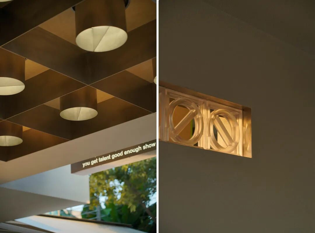一层原本属于室内的区域以内退的方式变为户外廊道,使室内和室外形成灰空间的过渡。虚实相间的框景辅以描边加固,序列矩阵的天花筒灯以及立面的“禁止符”道具灯,则是琉璃窗花的再度延续,其谐音梗“禁止流离”寄寓默契无间的人际生态和充满归属感的社群温度。