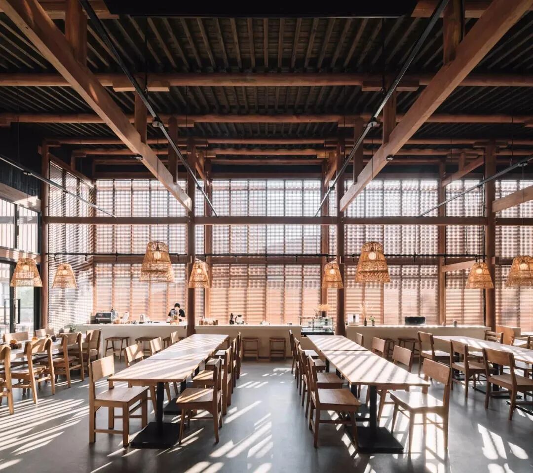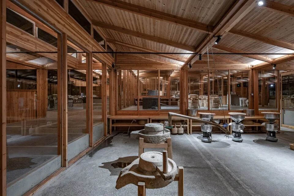 豆腐工坊的建筑与村庄环境融为一体,顺着地形原有的趋势,从村口绵延向上。工坊的车间功能按照生产的工艺流程沿地形阶梯向上。建筑的一侧设有供游客参观的通廊,游客可以顺着楼梯按顺序观看到豆腐制作的整个过程,最后到达最顶端的品尝区。这里不仅可以尝到新鲜出炉的豆腐,也能欣赏到溪水对岸历史村落的美丽景致。工坊整体采用木装配结构,在实现现代工坊生产目的的同时,也与村庄内传统的榫卯结构房屋相呼应。