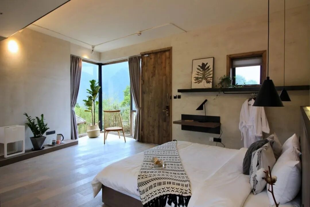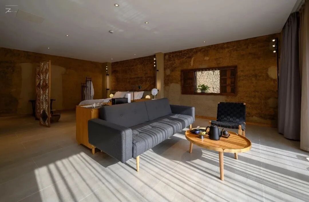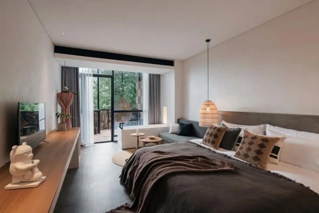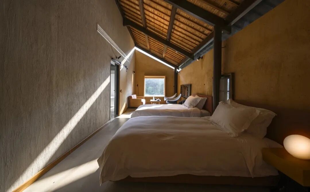 云端觅境藏在松阳西坑村最深处,临着山崖面朝峡谷,独享一片山林美景。民宿由15户老夯土民居改造而成,既保留了传统浙南古村落特有的夯土民宿特色,又融入了现代元素。它足足占地2000㎡,却只打造了15间客房,房间内超大的落地窗,或是不同朝向不同尺寸的窗户,都将最美的山野林景收纳在窗框内,宛如一幅生动的画卷在你眼前铺开。