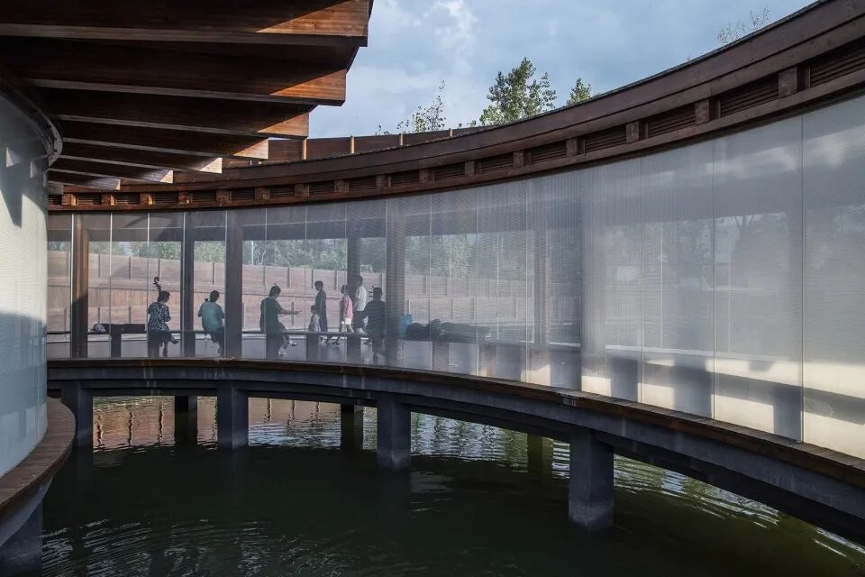 项目采用木装配结构,作为低碳建造,以及与传统木构建筑对话。螺旋形成的弧型空间导引使用者进入,玻璃墙面交替变化的渐变透明度则构成另一层次的空间转换。游客从入口处进入,视线仍然停留在室外的山水景观,随着弧线空间导引以及玻璃透明度变化,将逐渐将视线收回转换到内部庭院的绿化景观。玻璃的渐变透明度也在多雨的季节形成雾气般的立面形象。通过空间形态和立面转换,形成山水之间层次丰富的内外空间交替。