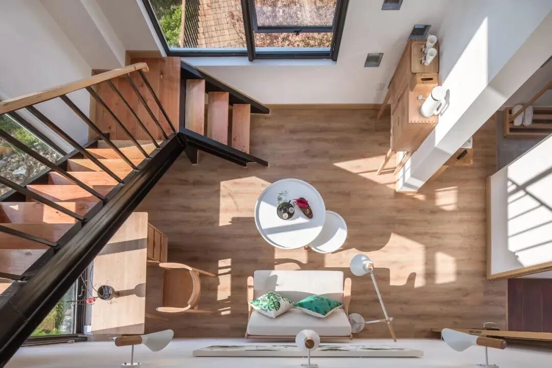 抬高的屋顶高窗引入风景和光线,故意保留的墙壁,仿佛双手便可触摸旧时光。而跨入卫生间,纯白的瓷砖不留痕迹的把空间完美切割,仿佛进入另一个次元。