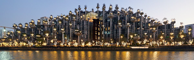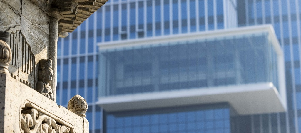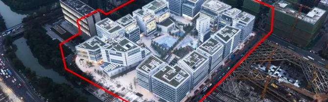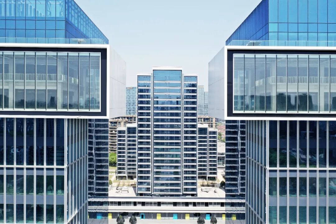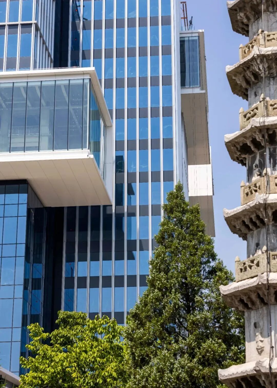 杭州英蓝中心位于世界文化遗产京杭大运河畔,毗邻千年古刹香积寺,是一组富含当代艺术气息的现代综合体建筑群。