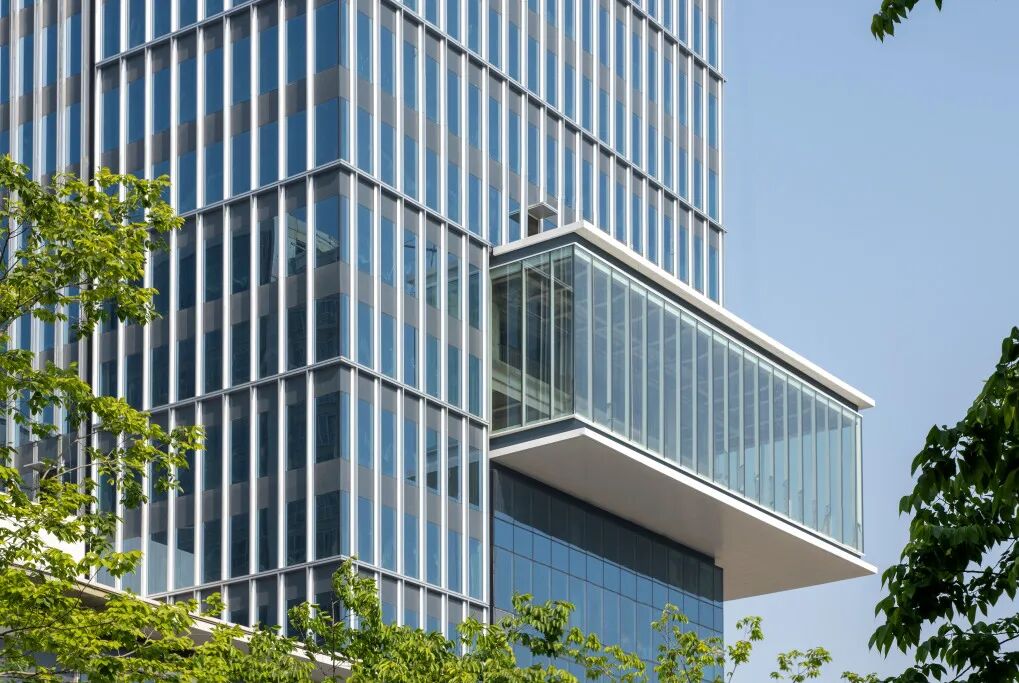 建筑设计师以极简主义风格将办公楼设计为七分塔结构,打造出树木向上延长的意象。在此意象之上,三个插入的“玻璃盒子”仿佛枝杈间的树屋,使人们可以突破塔楼的主体边界,走到常规高层建筑无法抵达的位置,体验仿佛悬停于半空中的漂浮瞬间。