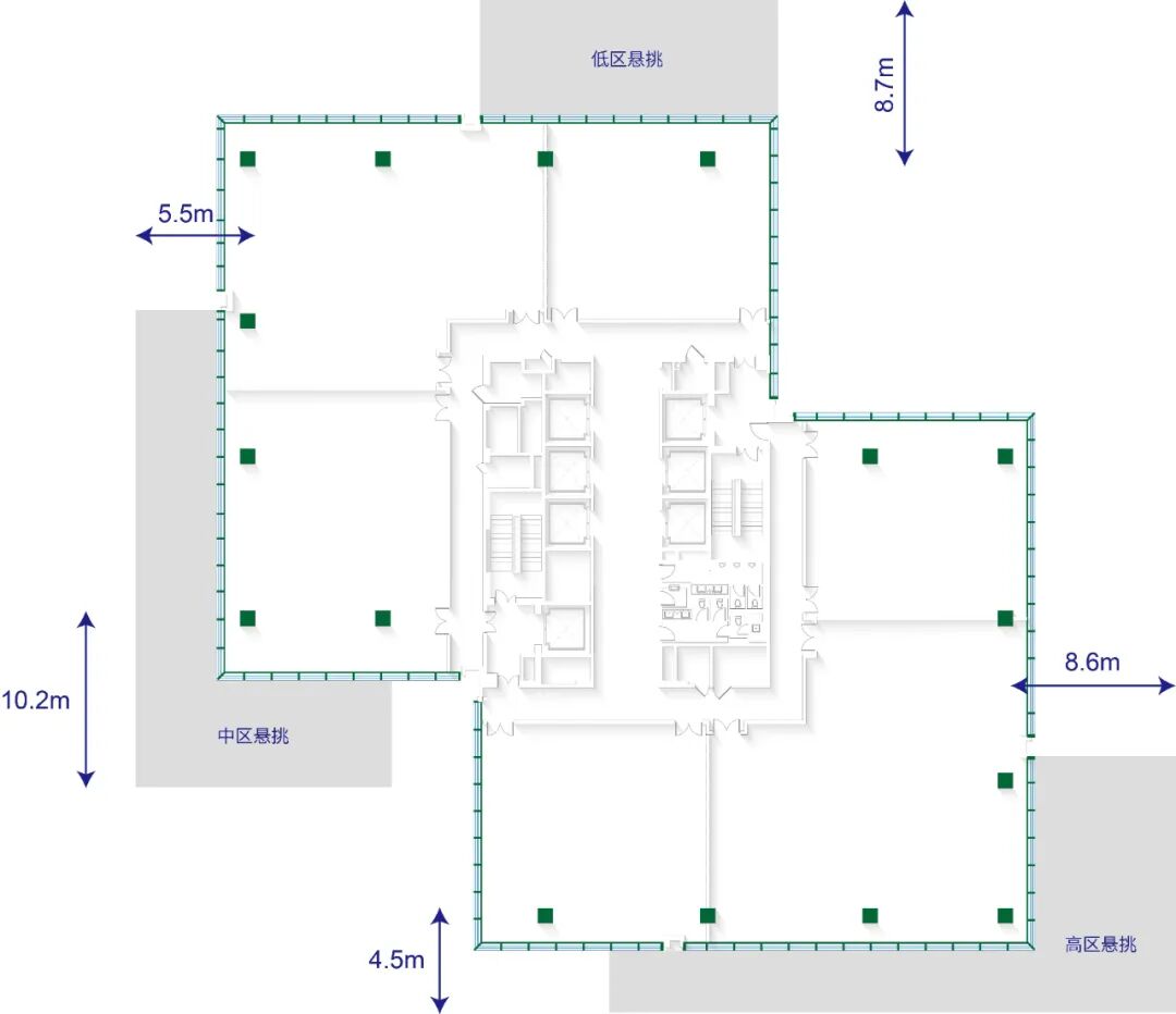 建筑为两栋对称的塔楼,建筑师在每栋塔楼的三个区域设置了不同大小的悬挑,向外延伸出不同的距离,最大的悬挑区域水平向外延伸超过10米,垂直高度8.8米。