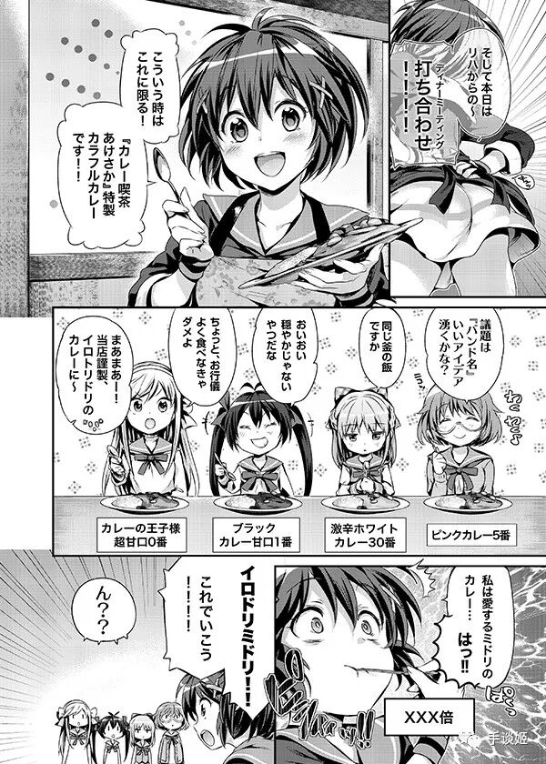 那么《イロドリミドリ》究竟该怎么翻译呢?萌百给出的翻译是《彩绿》,感觉这样翻有点僵硬,于是手谈姬专门看了下漫画,发现漫画里其实也是很随便的,组合里的大家想不好取什么名字,于是莫名其妙吃起了咖喱,争论着什么咖喱好吃,就把名字给定下来了。