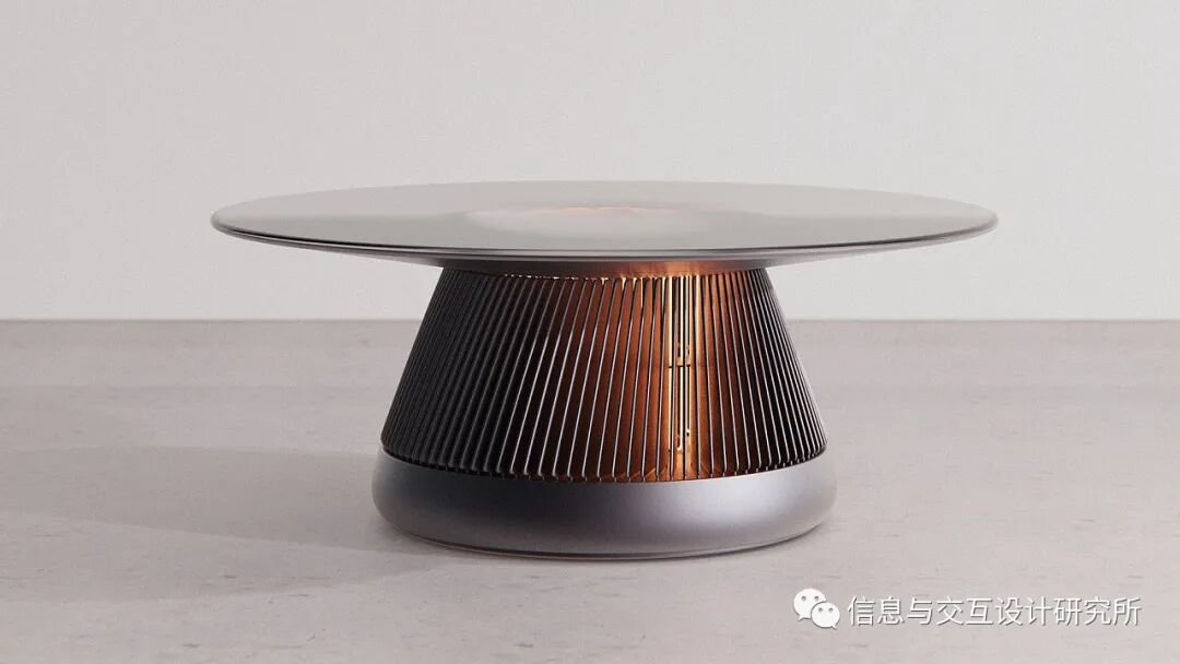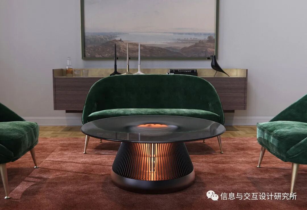 炉膛的运行就像一个巨大的恒温表盘,伪装成当代圆形咖啡桌。顺时针旋转桌面会导致以机械方式逐渐打开炉膛的翅片底座,从而暴露出温暖的核心和环境光源,不同程度地散发出小火。