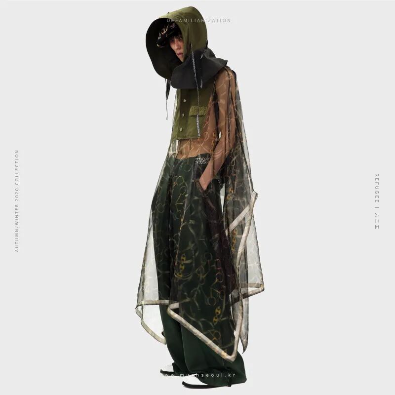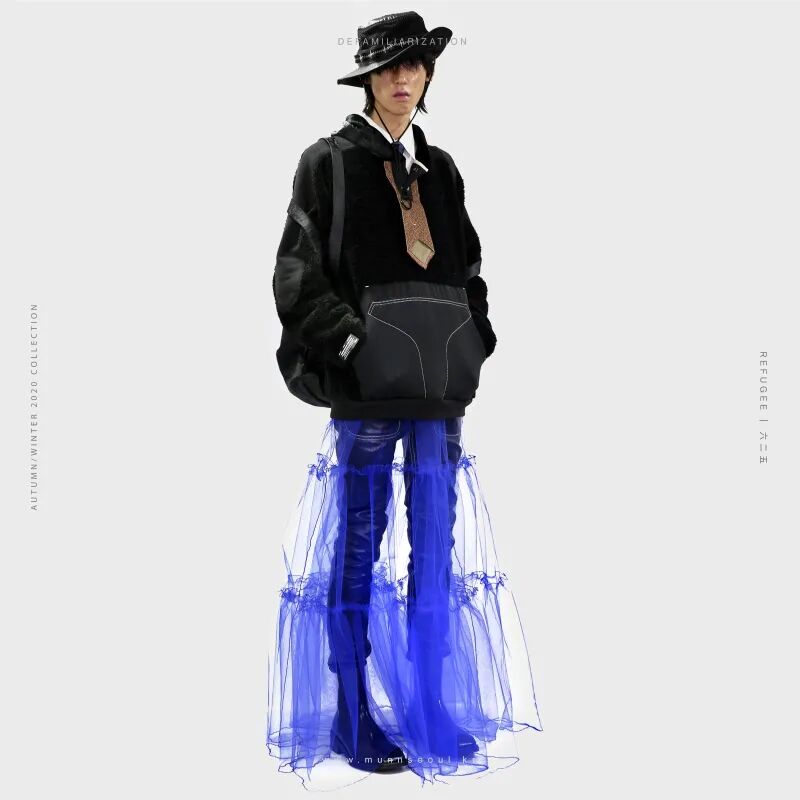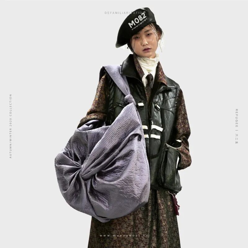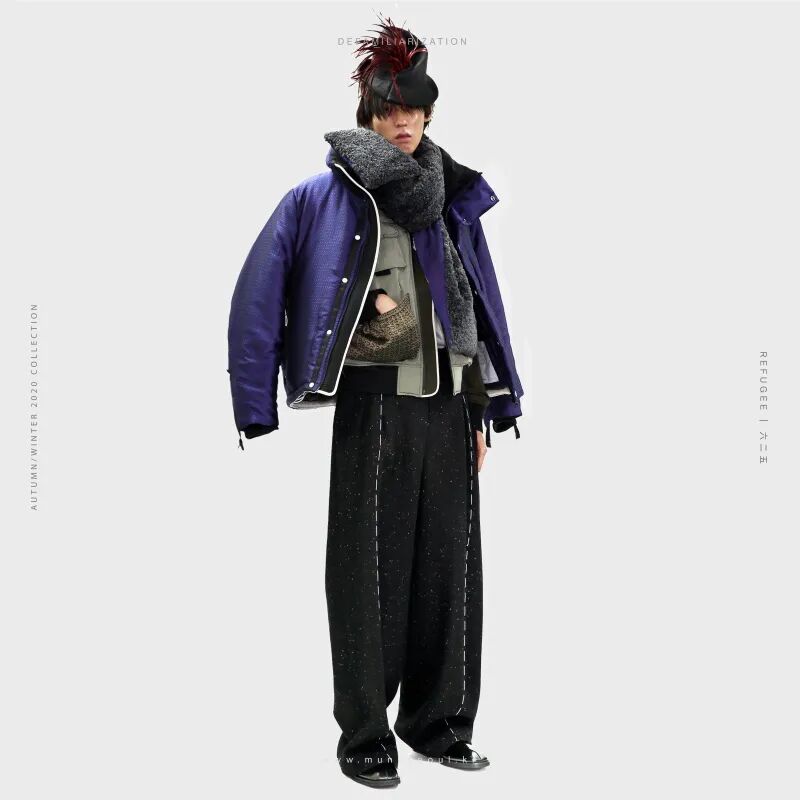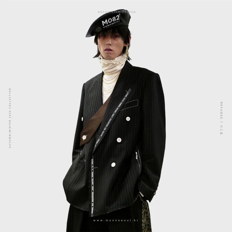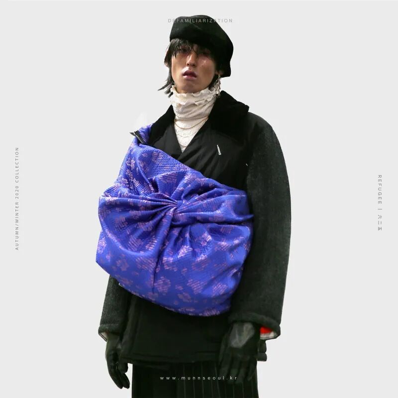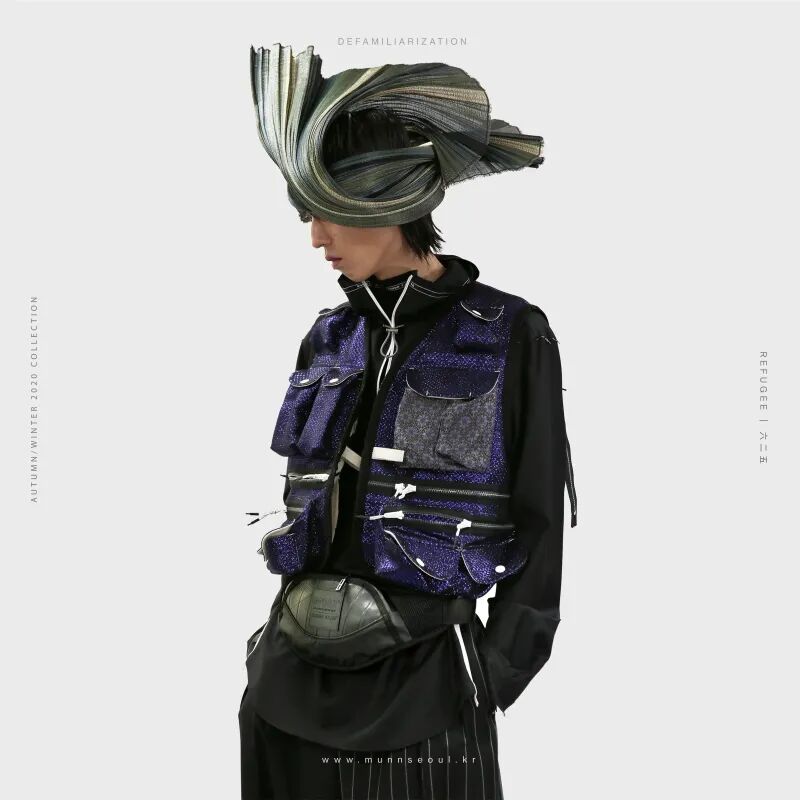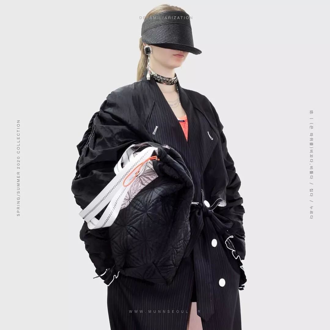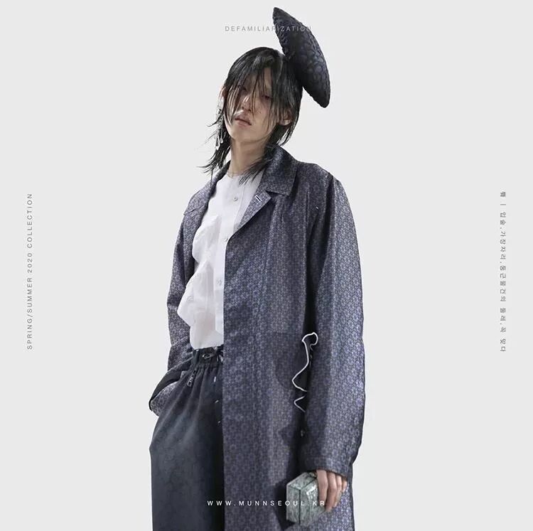 Münn 2020秋冬系列,设计师Hyun-min Han以一贯擅长的解构技巧,将传统的韩国民族服装文化融入街头潮流。传统韩国印花元素、实用功能性口袋与拉链、个性十足的布边外露设计,将年轻人的痞坏与不羁表达的淋漓尽致。