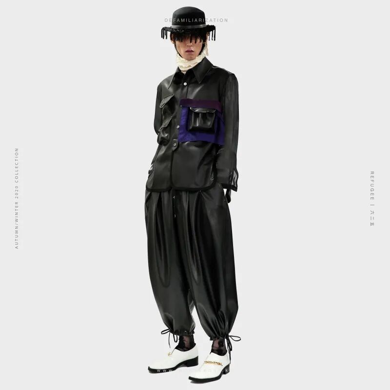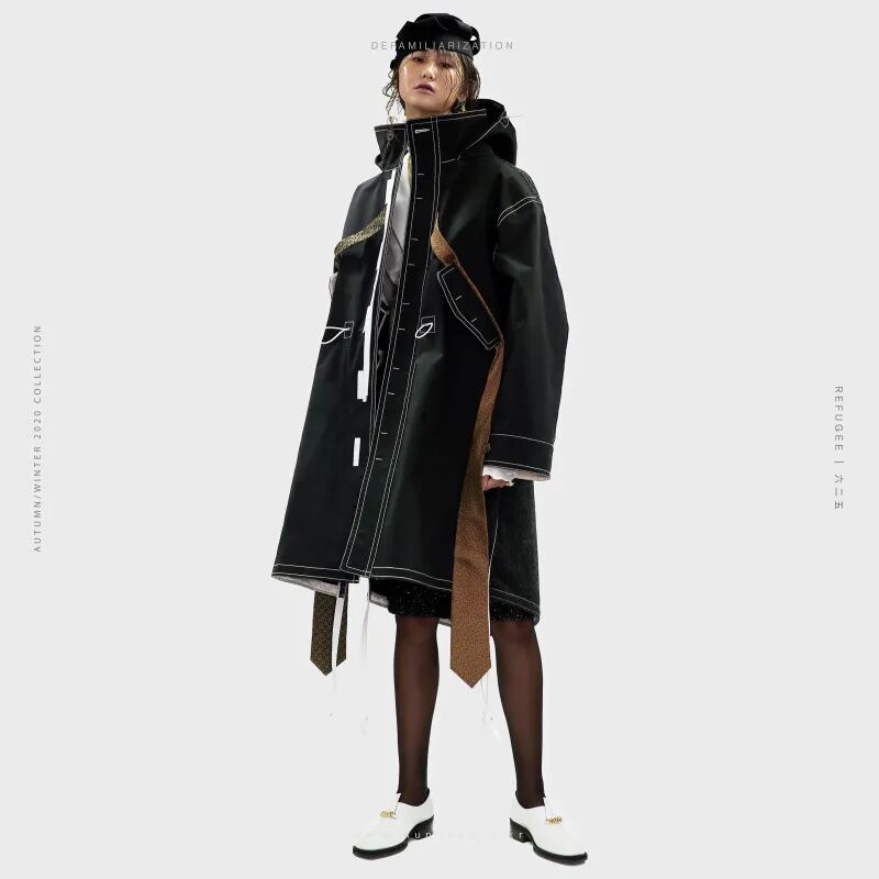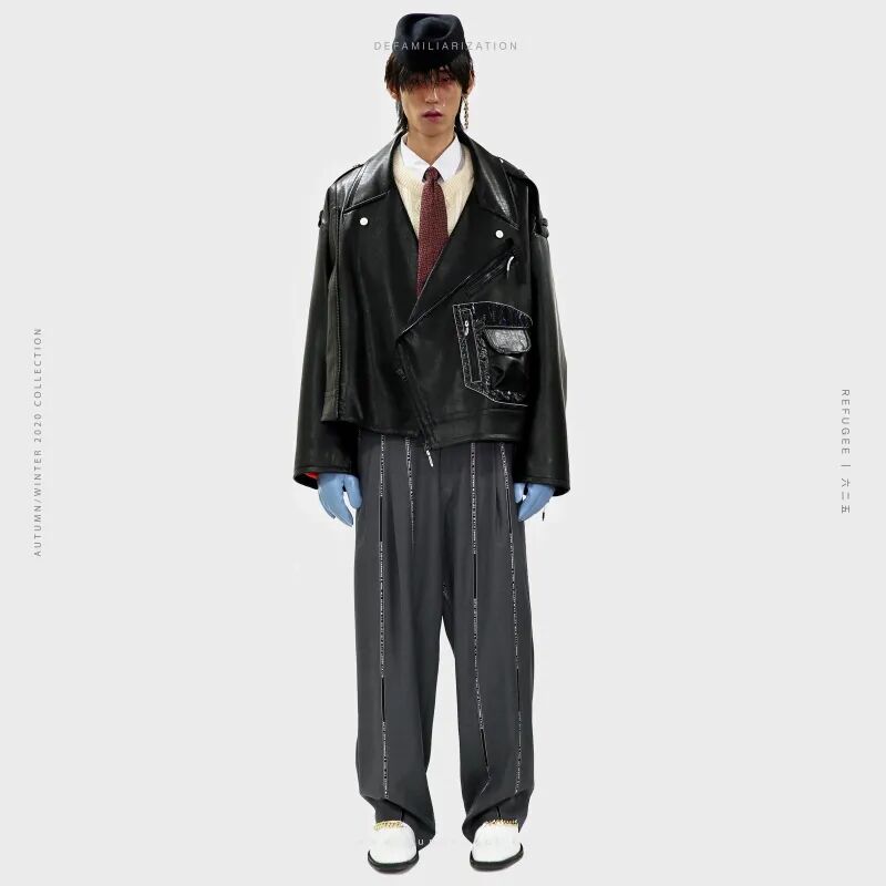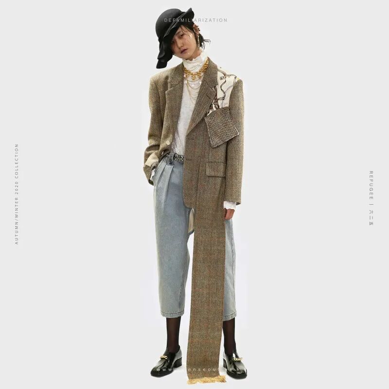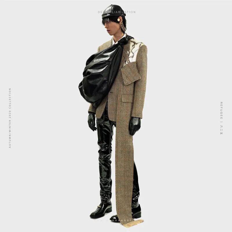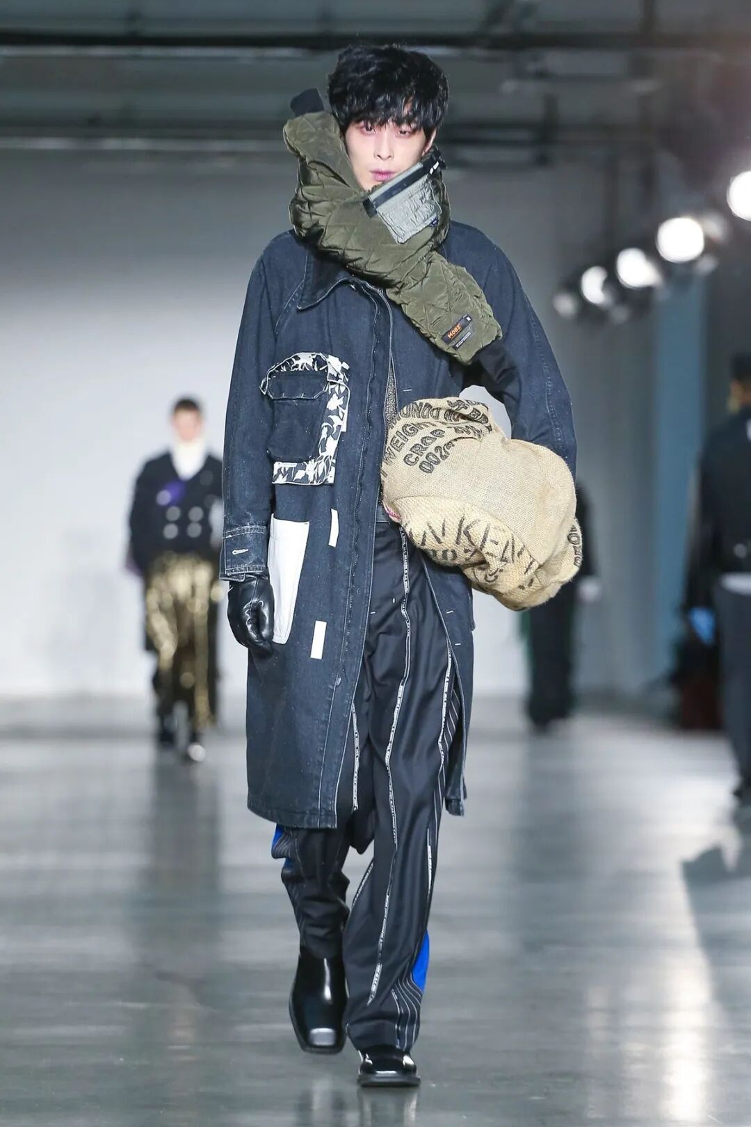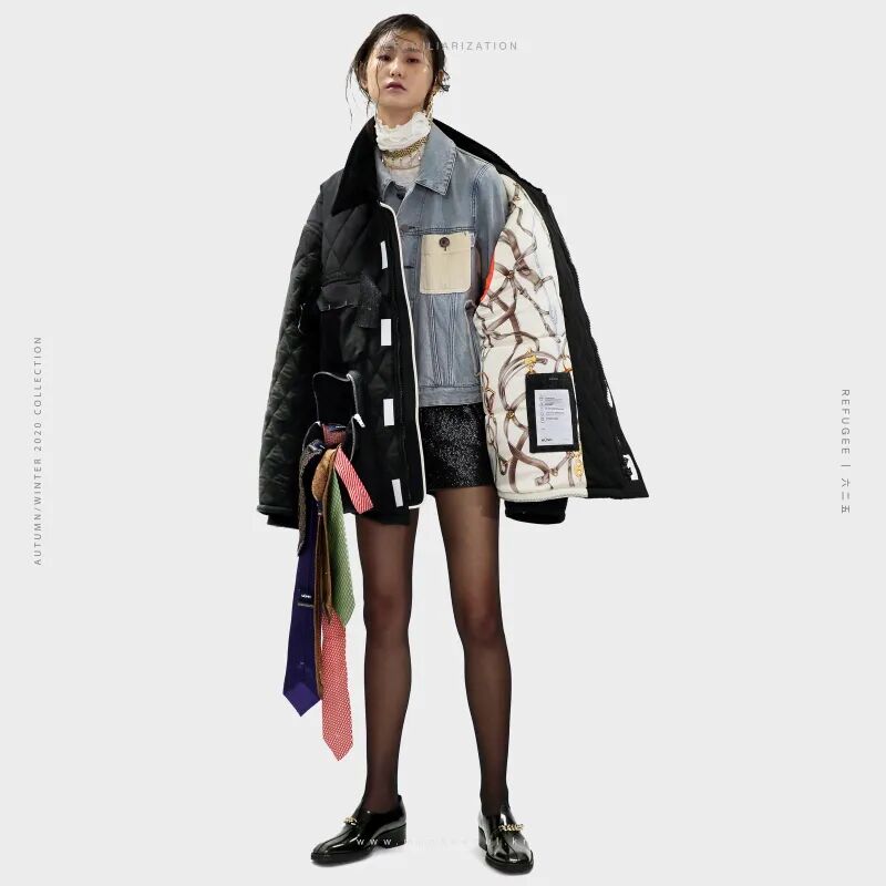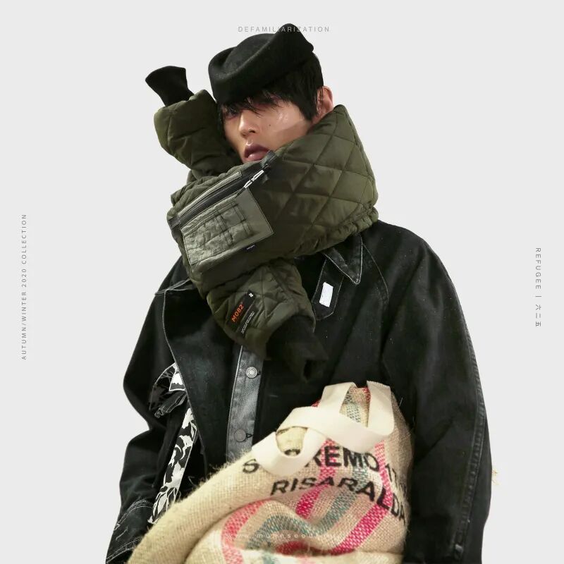Münn 2020秋冬系列,设计师Hyun-min Han以一贯擅长的解构技巧,将传统的韩国民族服装文化融入街头潮流。传统韩国印花元素、实用功能性口袋与拉链、个性十足的布边外露设计,将年轻人的痞坏与不羁表达的淋漓尽致。