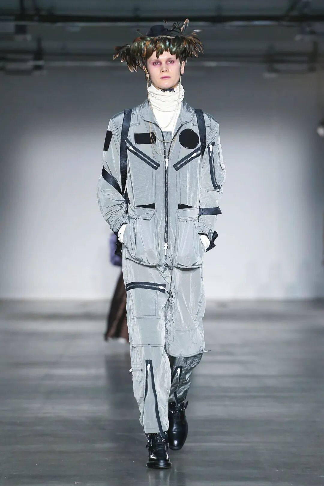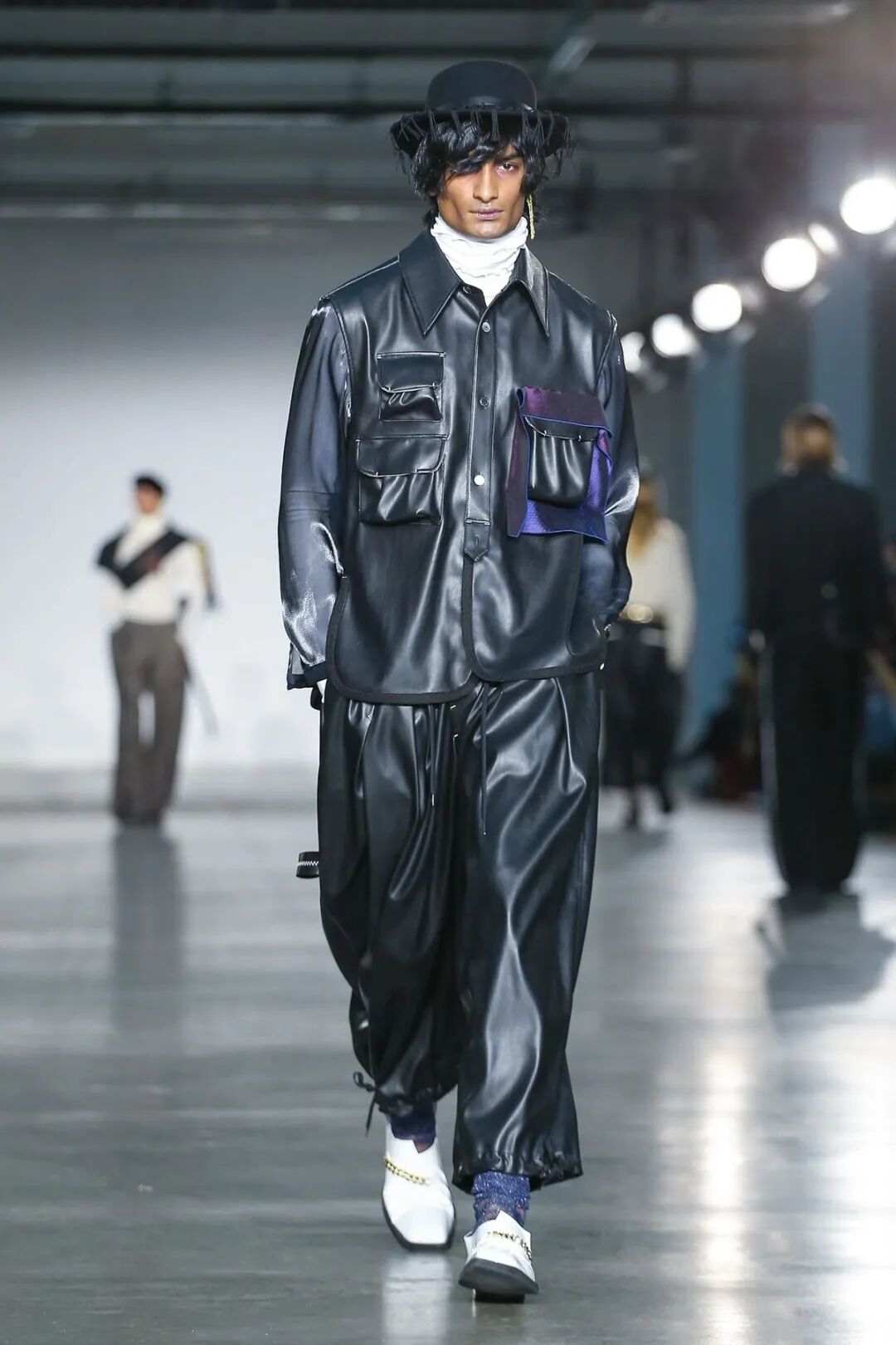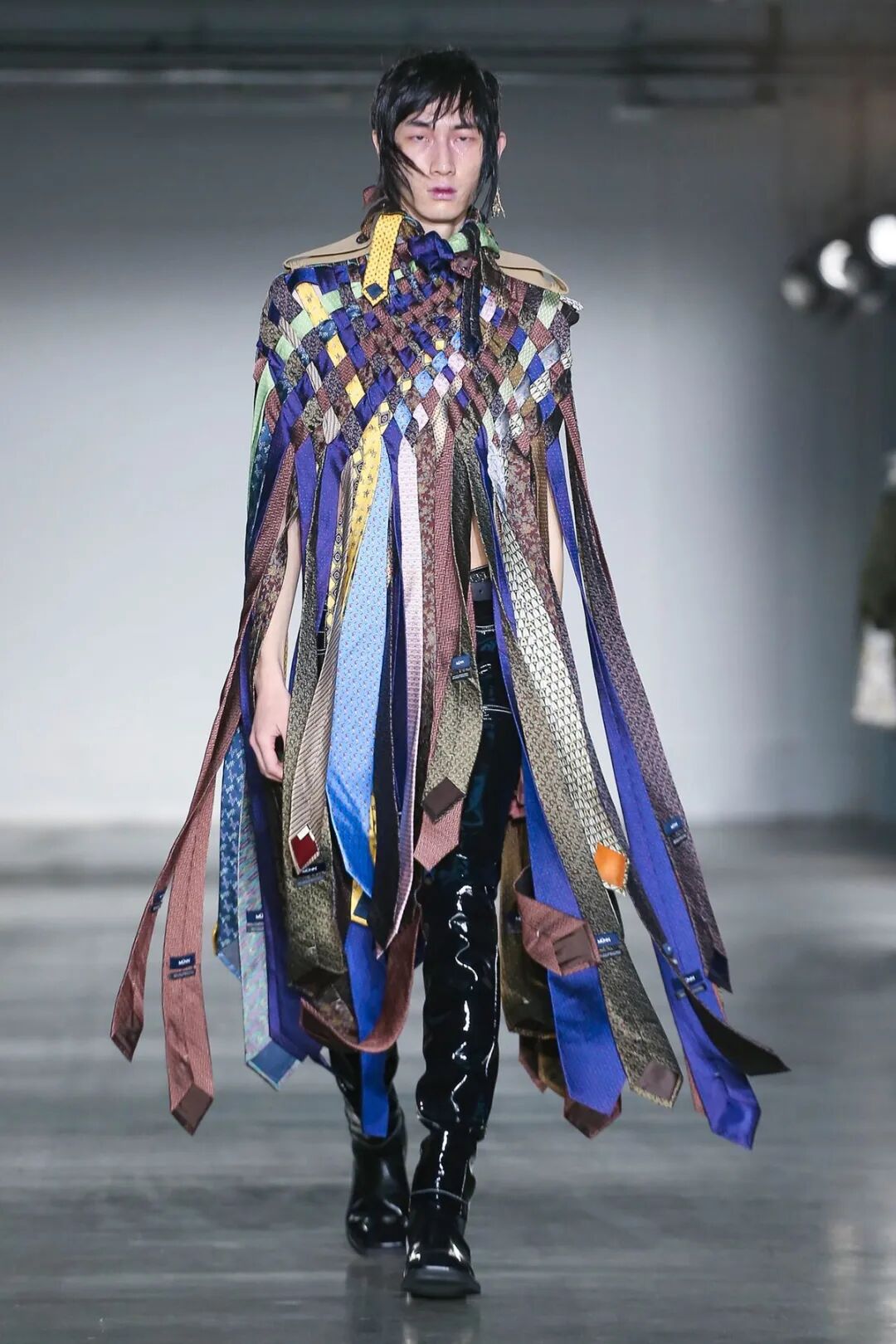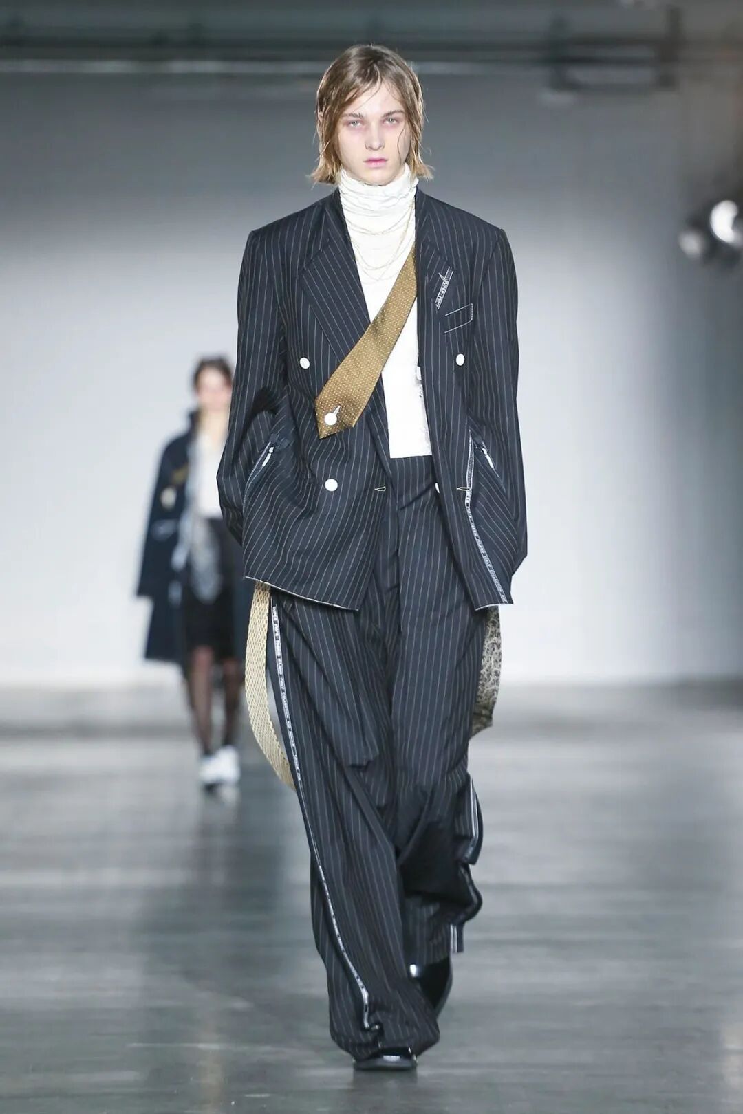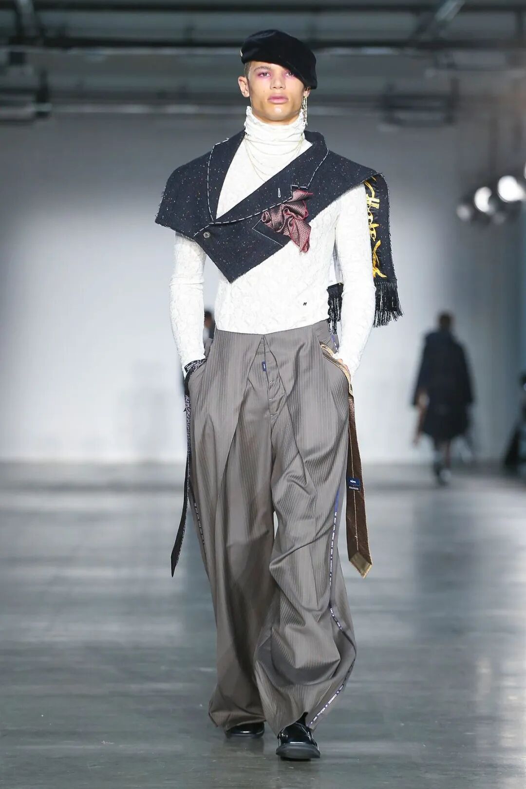 Münn 2020秋冬系列,设计师Hyun-min Han以一贯擅长的解构技巧,将传统的韩国民族服装文化融入街头潮流。传统韩国印花元素、实用功能性口袋与拉链、个性十足的布边外露设计,将年轻人的痞坏与不羁表达的淋漓尽致。