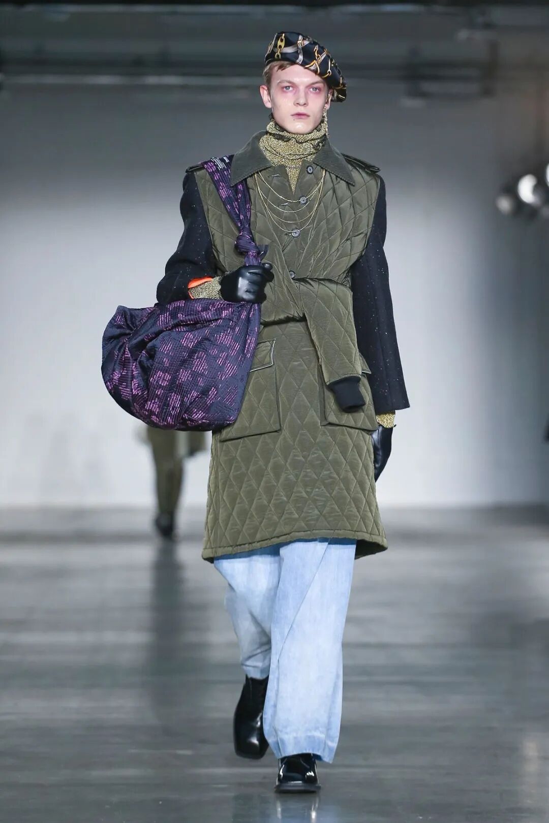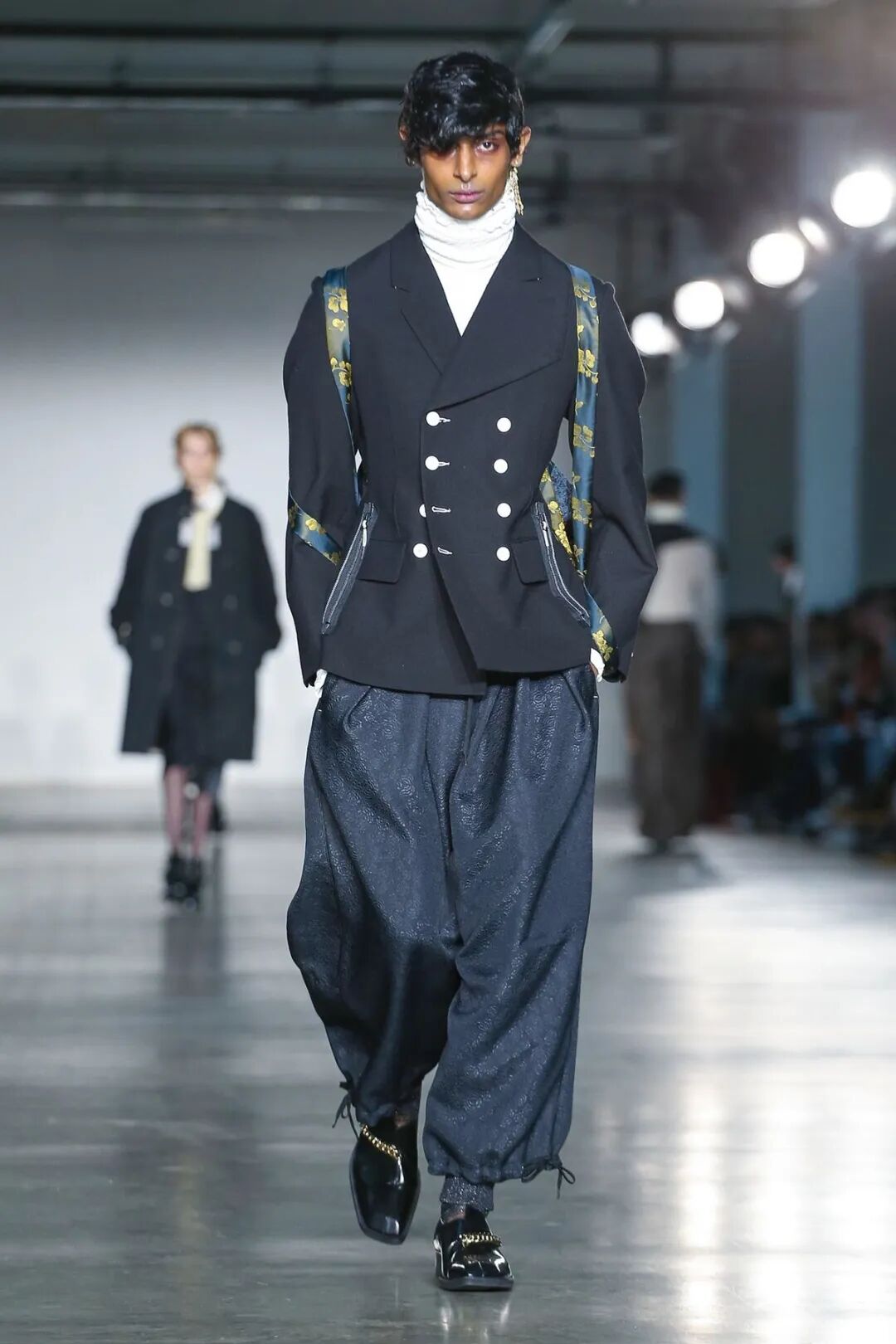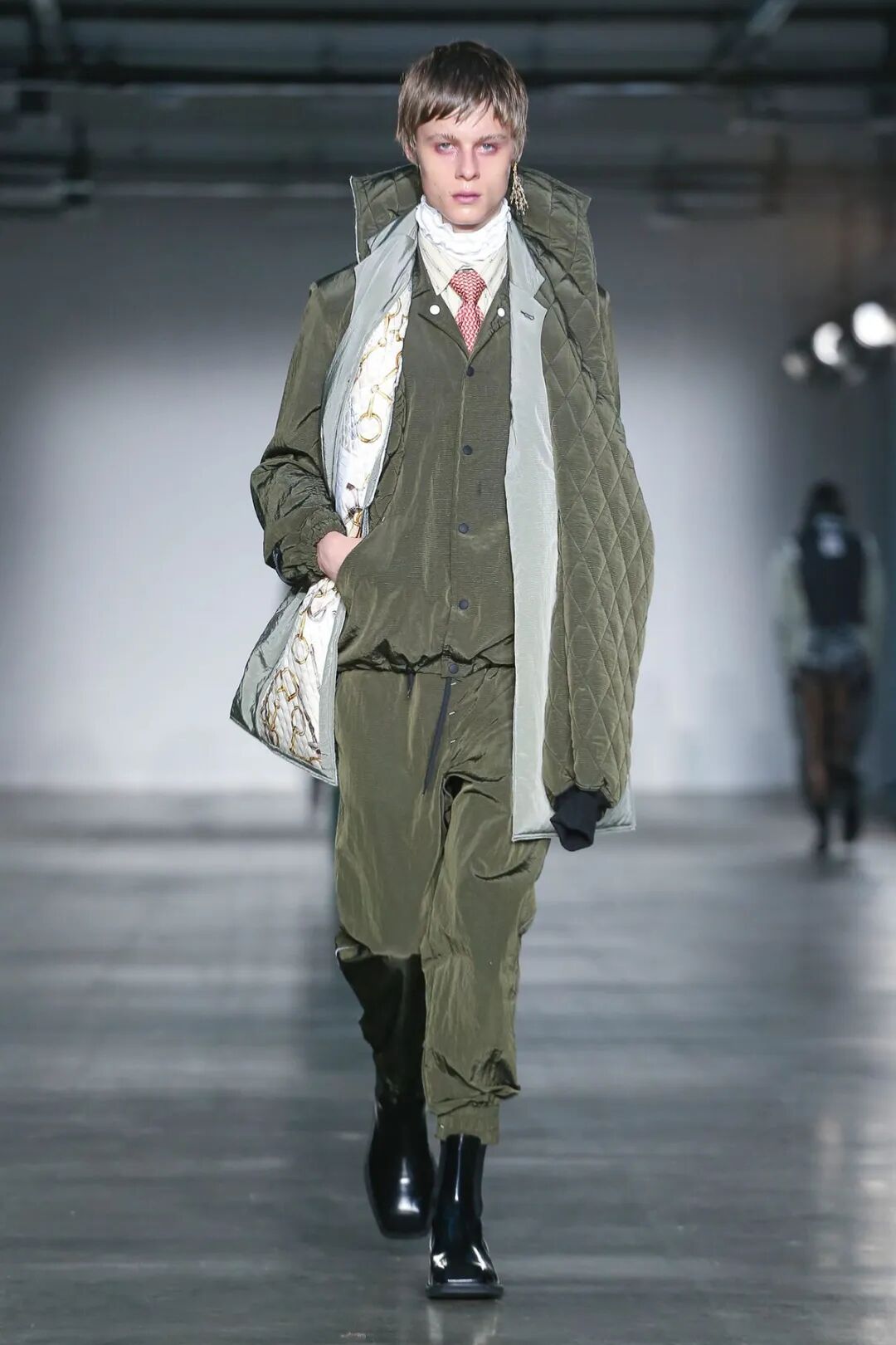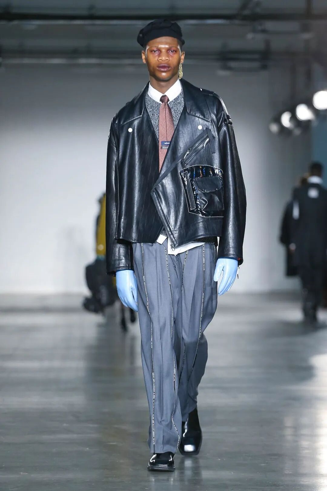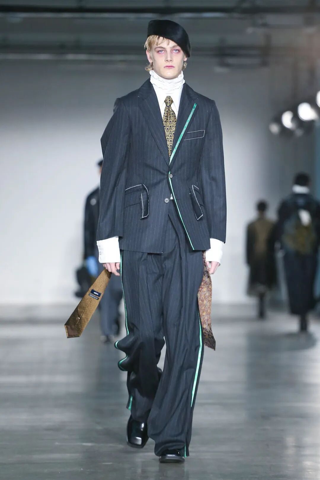 Münn 2020秋冬系列,设计师Hyun-min Han以一贯擅长的解构技巧,将传统的韩国民族服装文化融入街头潮流。传统韩国印花元素、实用功能性口袋与拉链、个性十足的布边外露设计,将年轻人的痞坏与不羁表达的淋漓尽致。