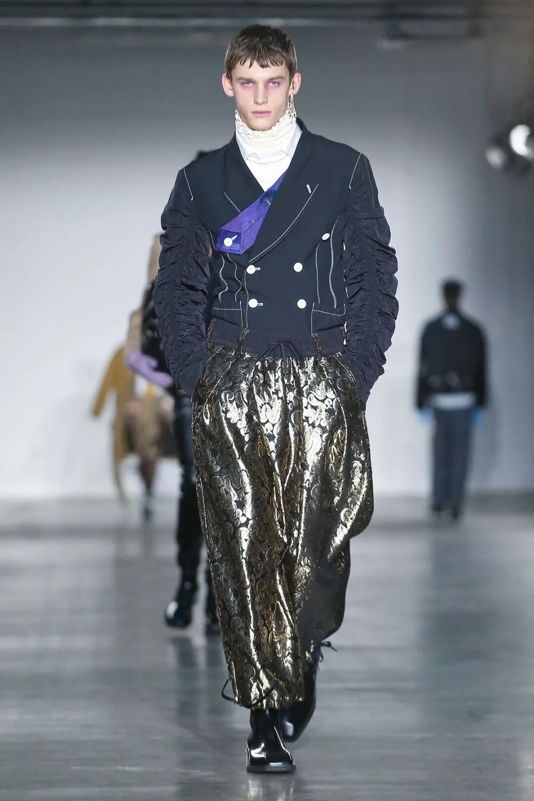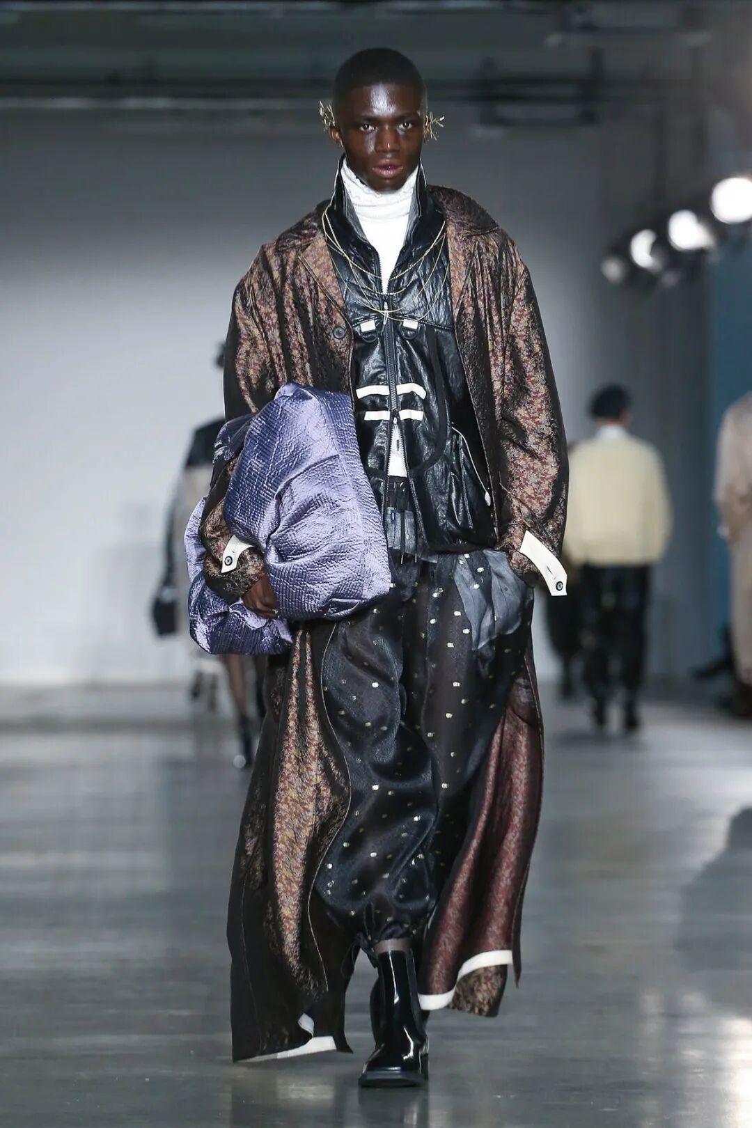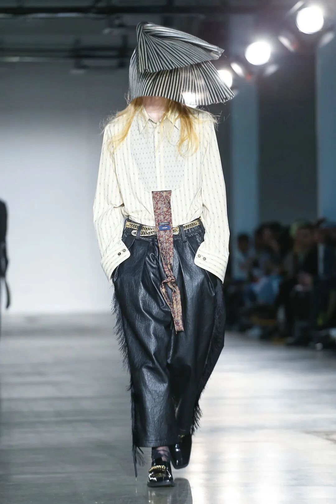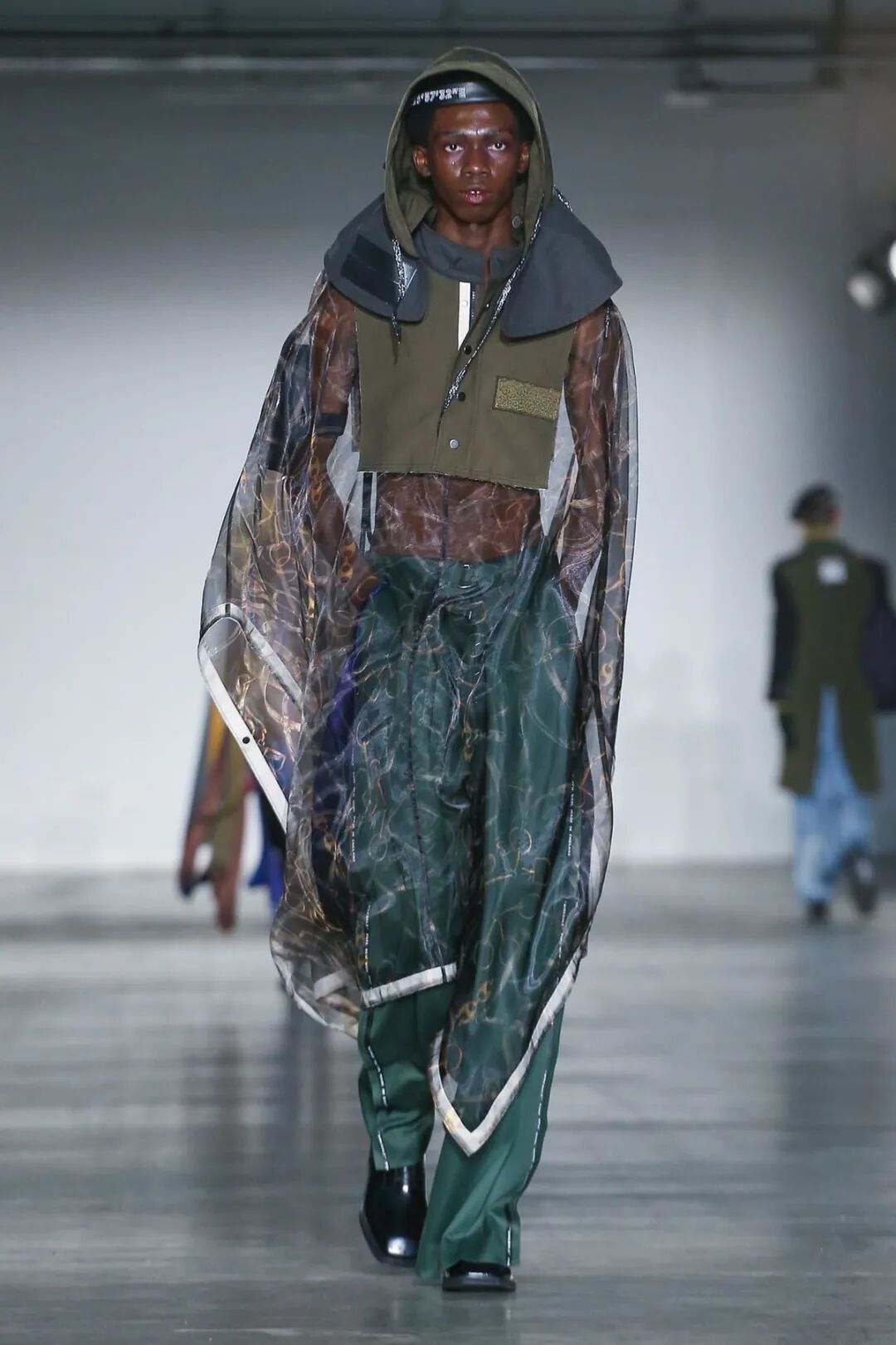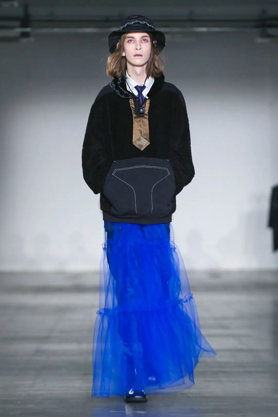 Hyun-min Han 采用了传统韩国面料和印花,辅以拼接薄纱,抽绳等工艺,并把焦点放置于裁剪的比例上。
