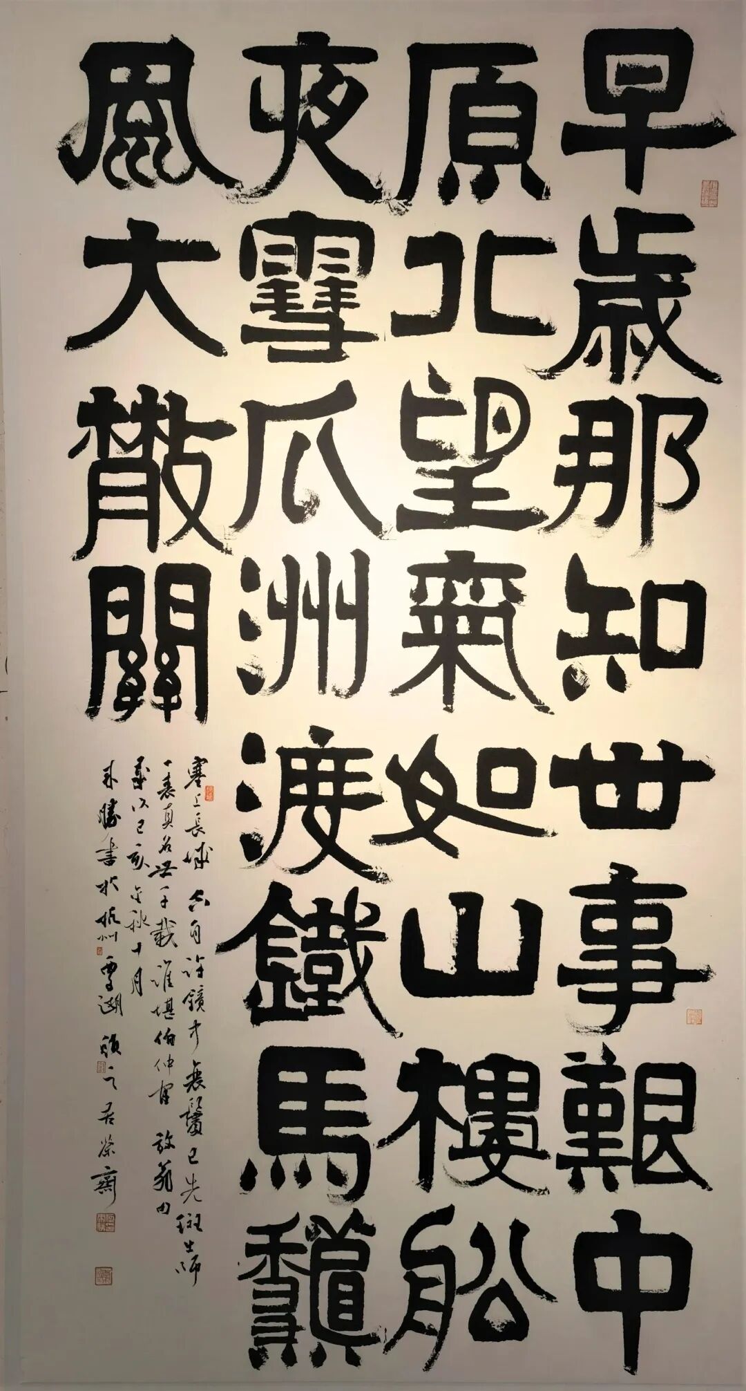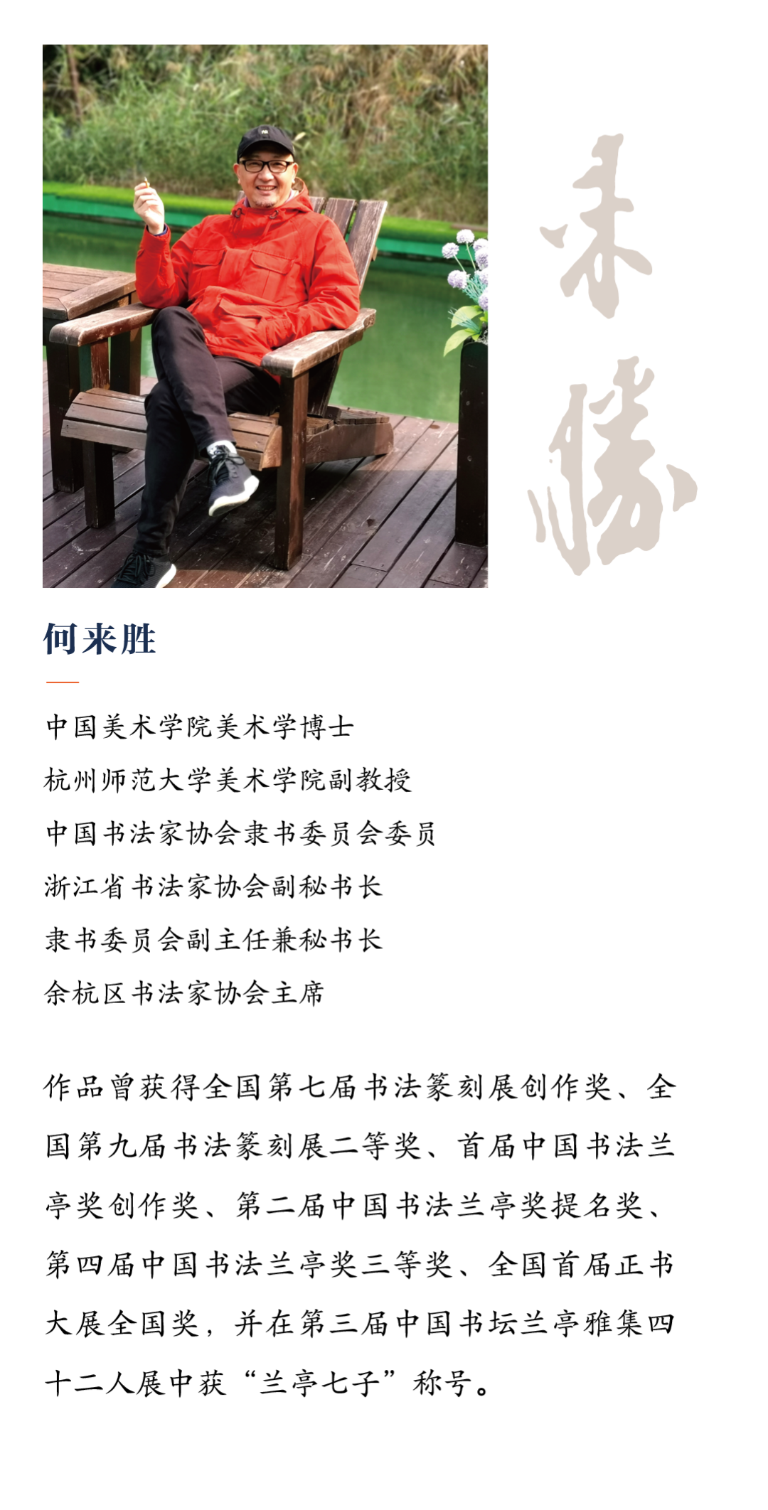 何来胜隶书是“全国粮票”,浙江写隶书的少壮派书家好像只有他“横空出世,莽昆仑”。他的隶书外貌一开始受到沈定庵先生影响,能够学得活灵活现。很快何来胜将眼光投向清代几个隶书大家,又同步浸淫煌煌汉隶,形质并重,庄谐合唱。他的聪明在于一直在最初的隶书框架内慢慢磨合,经常看会觉得没有什么大变,一段时间不看则会发现何来胜隶书暗自整形的“不依不饶”。他十分讲究技法锤炼以及某些处理细节在作品中的运用,用“绍兴黄酒”脑子思考写字。何来胜与常规隶书书法家拉开距离的实际行动是他已经把篆书、北碑两者一起移花接木进隶书创作,极尽疏密、盈虚、整齐、参差、展促、夷险、方圆、曲直诸势之能事,“志之难也,不在胜人,在自胜”,何来胜不断自我挑战,具庙堂气的隶书能否再上层楼那要看他后续的造化。“鹤鸣九皋,声闻于天”,要提建议,他可以从大量面世的简帛书中淘宝挖矿,开发新能源。
