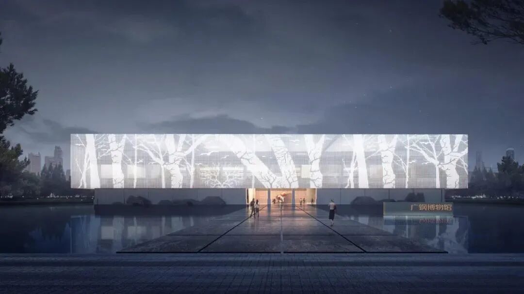 这个墙可以展示三个维度的场景。锈板是广钢遗址中象征性的铁锈红,所以代表广钢的历史;镜面的不锈钢是现代都市中象征性的反射和折射,人可以通过它照见自我,所以代表现在;把砖块转90度相当于可以看透墙面,所以代表未来。