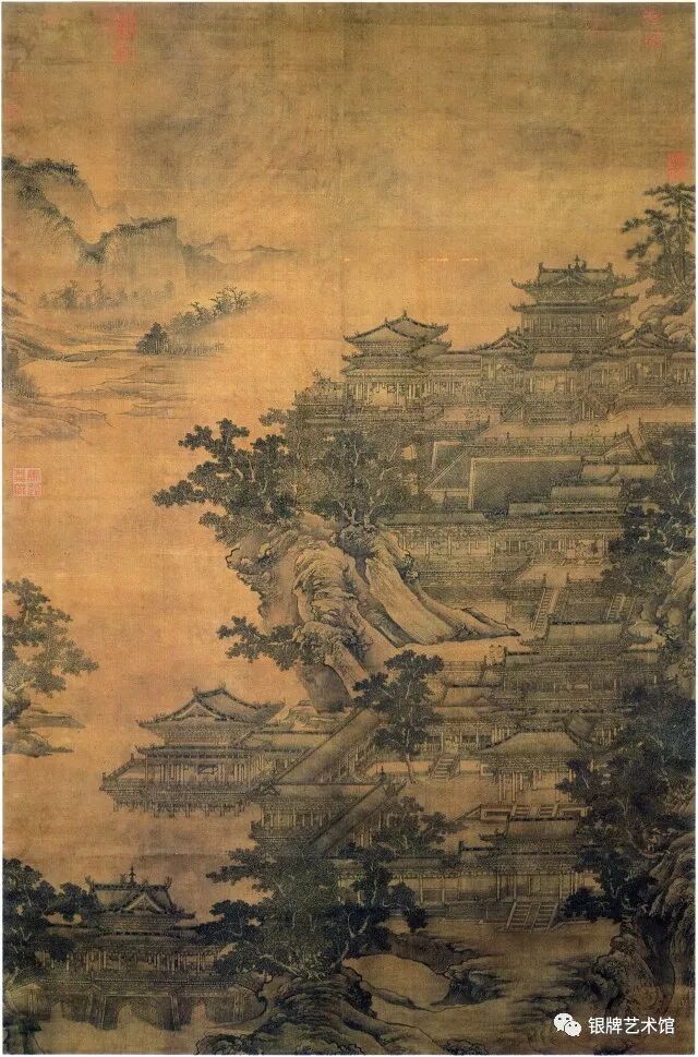 《汉苑图》画华丽的楼阁台榭建筑在高岭上。