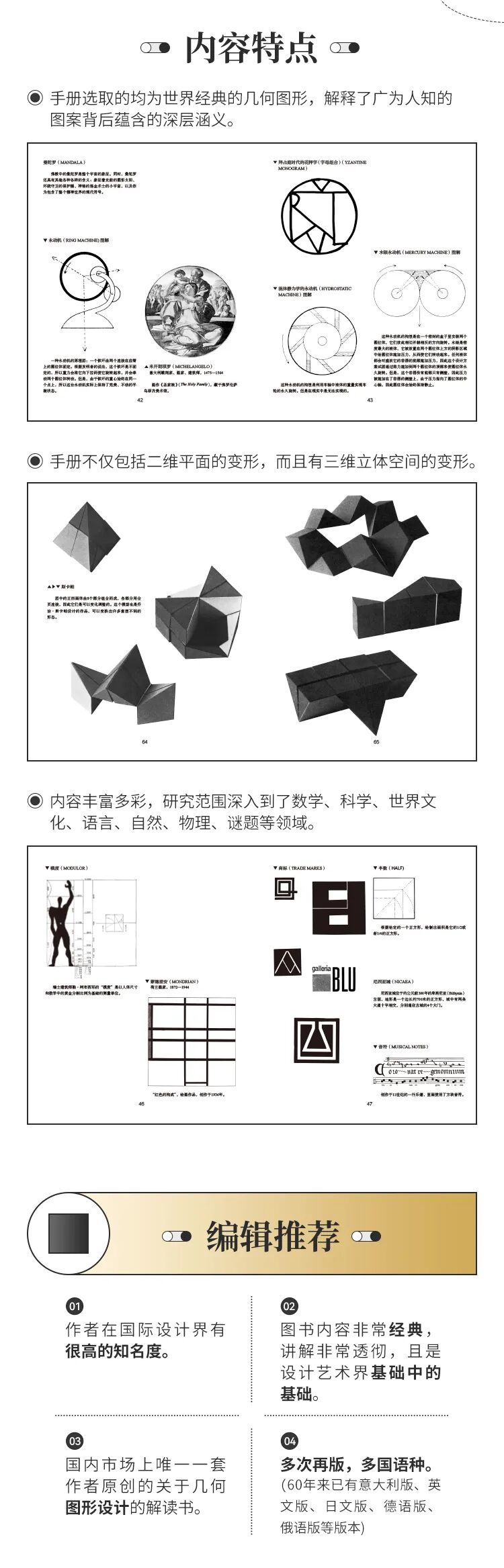 这是一套能启发灵感的图形设计书。《三角形》《正方形》《圆形》三本书可以帮助读者了解设计中“基础的基础”——三种几何图形(设计界称为“设计原型”)在设计中的应用法则和演变方式,并从历史、天文、几何、建筑、宗教等各个领域详细解读了每种图形演变背后所能呈现的设计效果和文化内涵,从而使读者获得更多的设计灵感和创意。