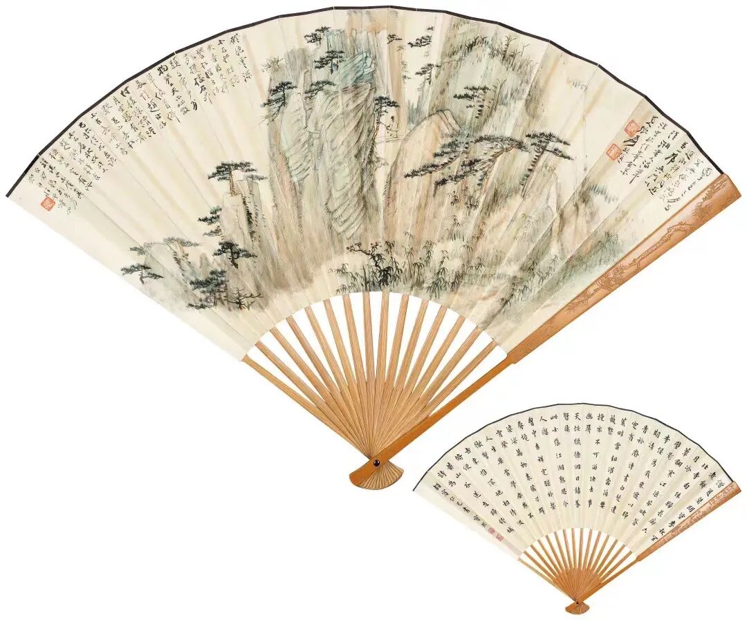 不同于团扇,折扇的扇面上宽下窄,有开合褶皱。折扇的扇面绘制便更加讲究,常需依扇骨、依褶皱安排画面布局。相比较而言,更加贴近中国画本身重意境轻写实的方向。