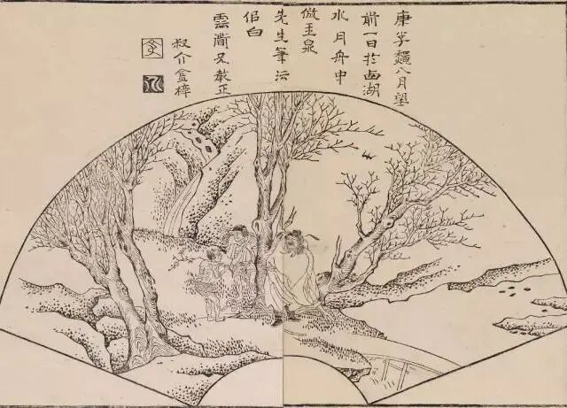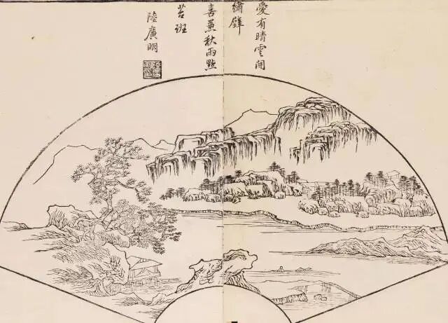 折扇至明中晚期,已非贵族士大夫专属。《名公扇谱》的流传使扇画山水进一步在市井阶层普及。《名公扇谱》由孙克弘、陈淳、文震孟、吴炳等画,张成龙选辑, 万历间武林金氏原刻,计四十八幅, 有山水、花鸟、人物等。