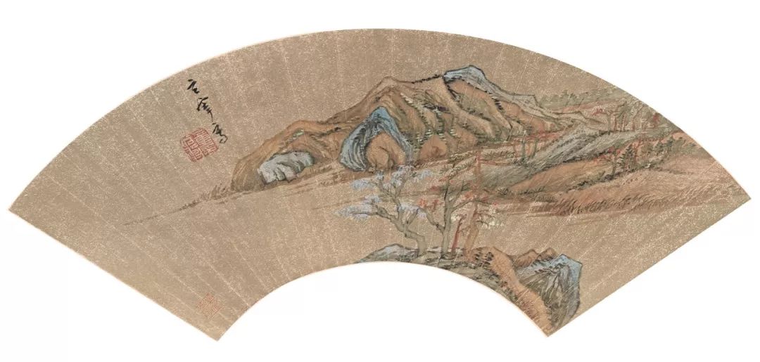当年声名煊赫的“吴门画派”扇面作品,现如今拍卖价格已达百万、千万元,比如沈周、文征明、唐寅、仇英、祝枝山等扇面画。其中,吴门四家之一的沈周,作为苏州文人圈中盛名一时的画家领袖,他无疑是折扇山水画领域的一位大师。如今我们依旧能够看到他留下来为数颇多的折扇山水画,比如他于1489年创作的《秋景山水图》,现藏于台北“故宫博物院”。