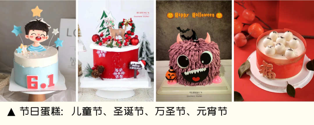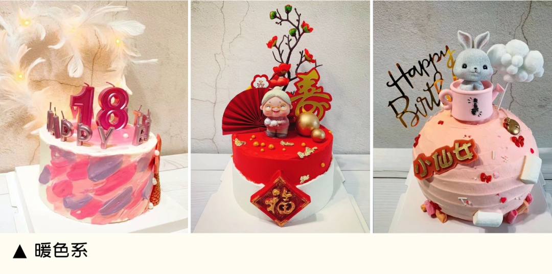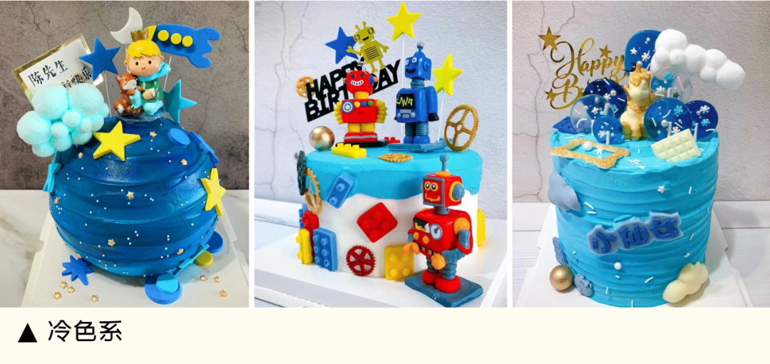 颜色不宜太艳丽:除非是一些主题非常明确的蛋糕,否则用色上不宜使用过于鲜艳厚重颜色,它会使蛋糕产生一种不自然的感觉,直白的说就是看起来不像食物。所以蛋糕可以多尝试使用一些亮度高、色度低的颜色进行制作,也能体现出奶油的质感。下图中左侧的蛋糕就明显比右侧的主题蛋糕食物感更多一些。
