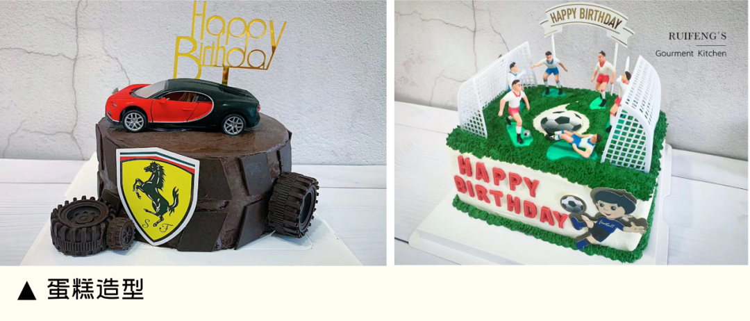 再如下图中两款男孩的世界为主题的蛋糕,设计的重点则是迎合小男孩的各类兴趣爱好,以玩具元素为基础,构建立体的场景或悦动的图形肌理,以活泼和玩耍作为设计重点。