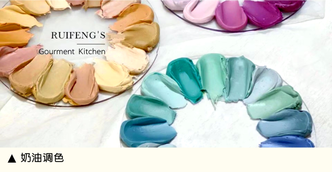颜色调制尽量由深到浅:蛋糕制作中白色的颜料一般都是奶油,建议一开始调色时尽量用少量的奶油霜,从而避免浪费食材。因为如果一开始用很少量的奶油霜,不小心把颜色调深了的话也是很容易补救,只需要加入一些白色奶油霜进行稀释就可以了。