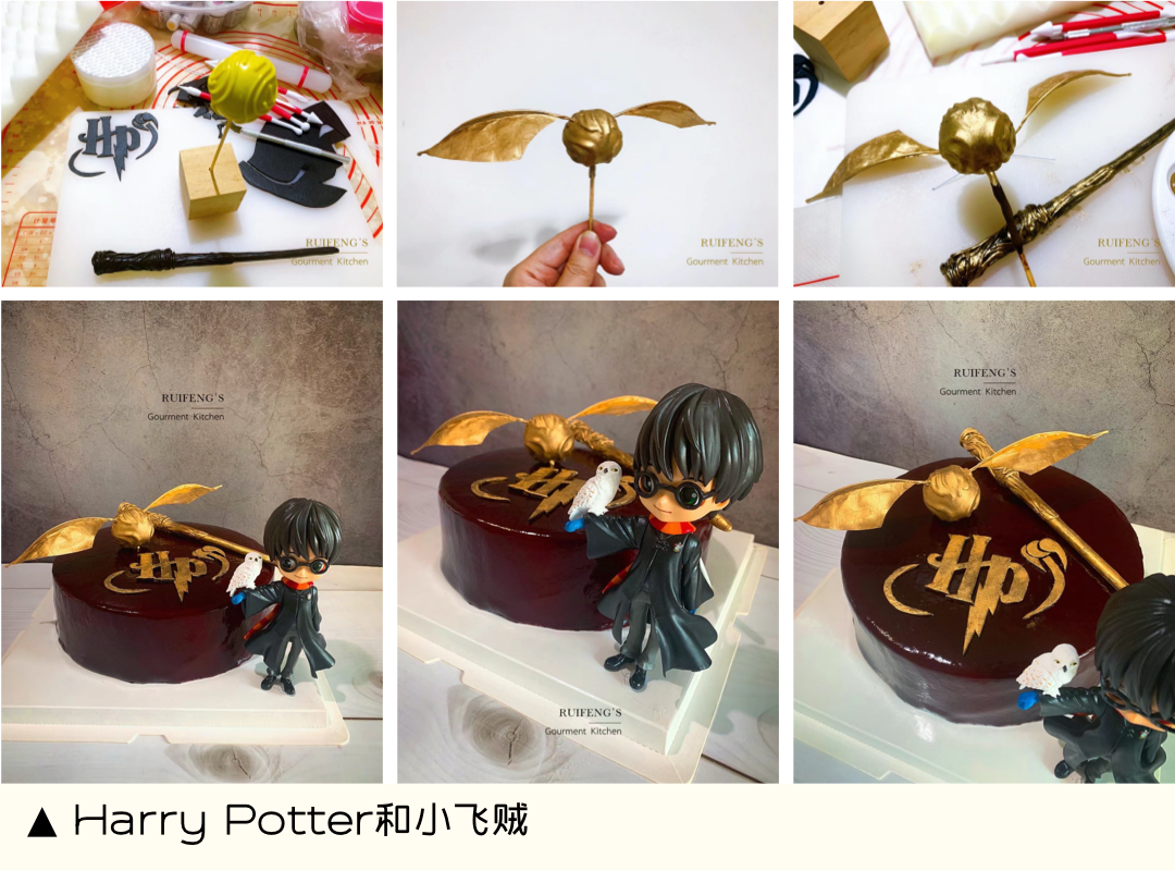 例如下图中的哈利波特蛋糕,设计的重点即在于制作围绕主角的元素内容,金飞贼和魔法杖能很好概括小哈利在魔法学院中最美好的回忆。加之偏暗色的奶油与金色铭文的结合,也表达了魔法世界的尊贵与神秘。